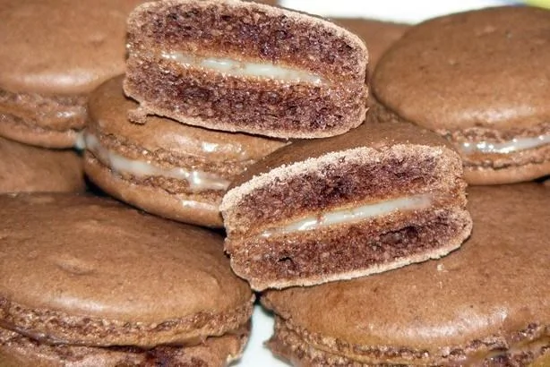 ШАГ 9 Как только макароны остынут, на половину из них выдавить из кондитерского мешочка прослойку и вторыми половинками накрыть так, чтобы ганаш был между макаронами.