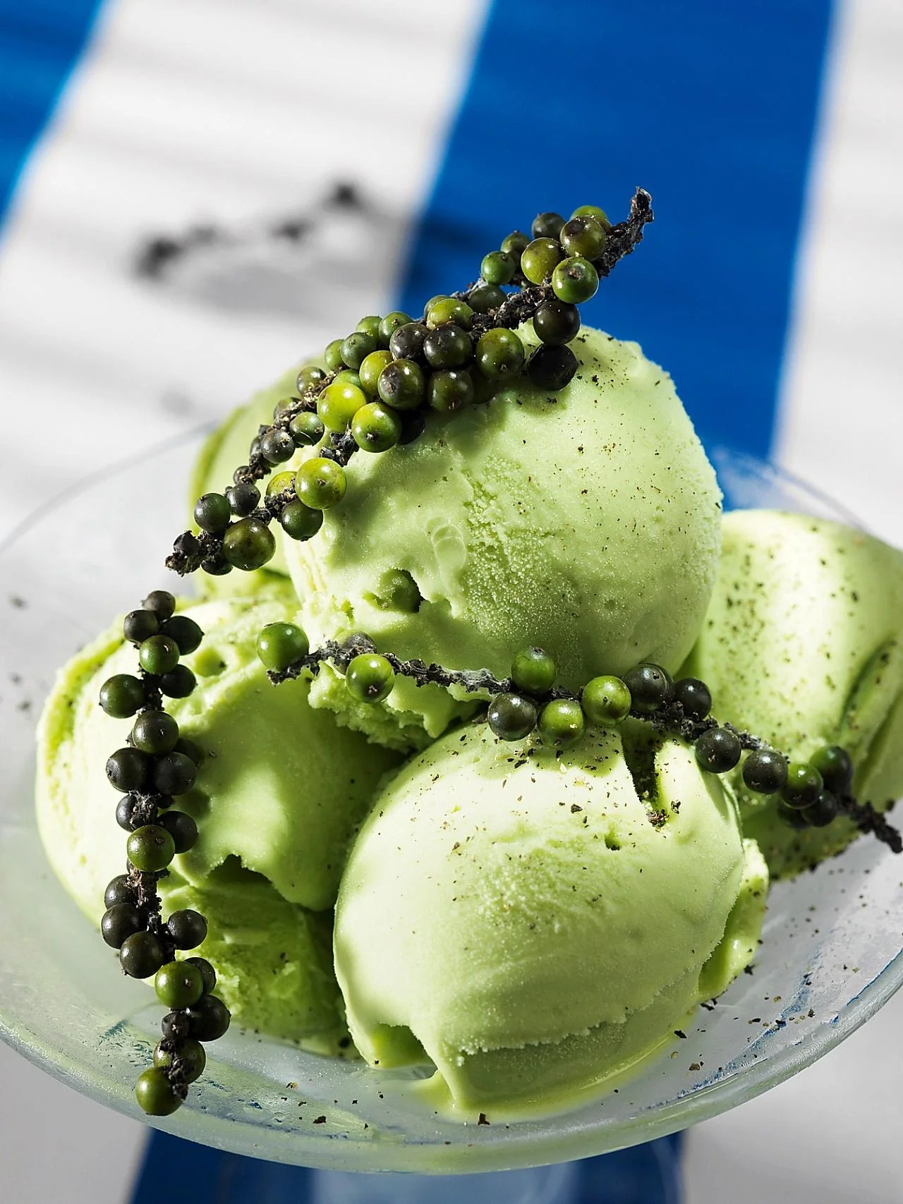 ШАГ 4 Поставить смесь в холодильник до полного остывания и только после этого положить в машинку для мороженого и довести до готовности: на это уйдет около сорока минут. Украсить черным молотым перцем и веточками свежего.