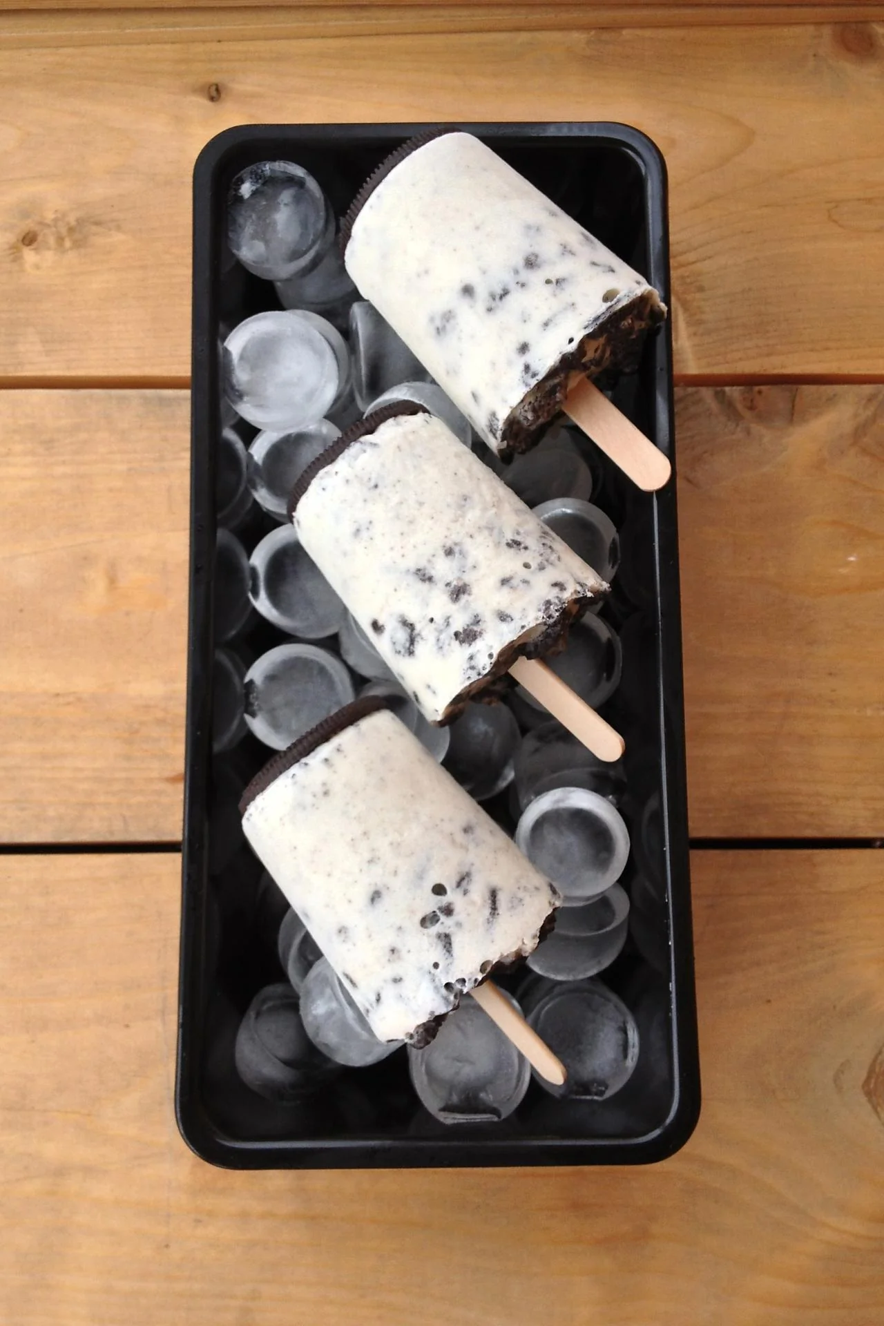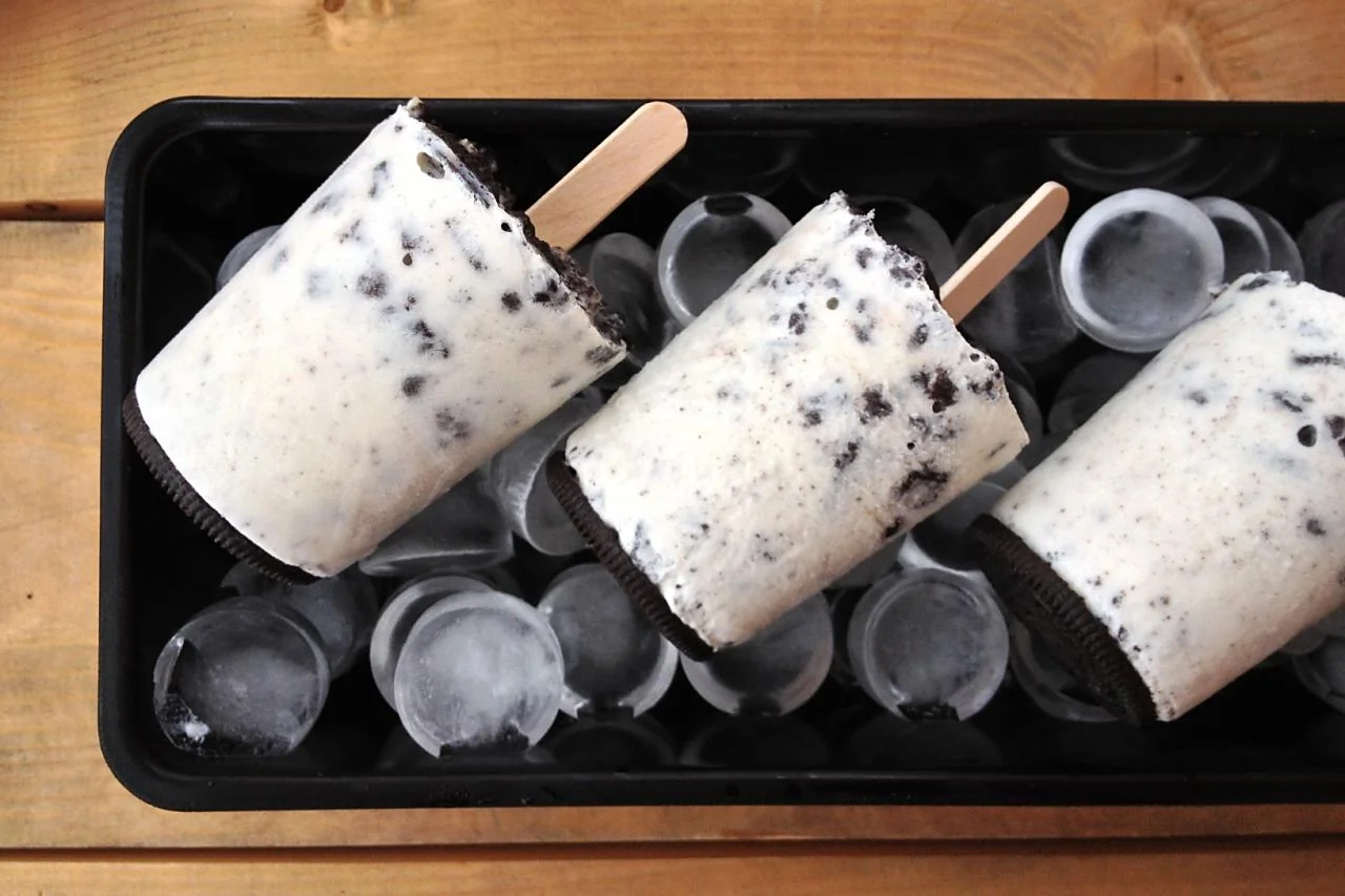 ШАГ 2 Растворите сахар в 60 мл воды, добавьте молоко, сметану и предварительно взбитые сливки, добавьте раскрошенное печенье, хорошо перемешайте. Рассортируйте получившуюся смесь по пластиковым стаканчикам для мороженого и отправьте в морозилку на час, после чего вставьте в слегка застывшее мороженое деревянные палочки и оставьте до окончательного застывания.