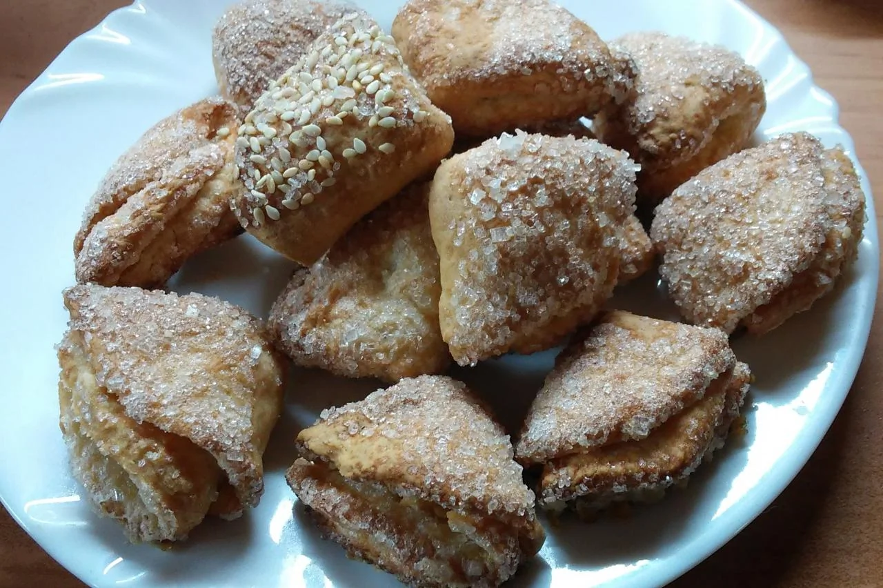 ШАГ 3 В отдельно насыпанную неглубокую тарелку насыпать сахар. Положить этот кружочек и надавить ладошкой, чтобы сахар прилип. Сложить этот кружок напополам, сахаром внутрь. Снова прижать к сахару. Затем снова так же сложить сахарной стороной внутрь. Одну часть прижать к сахару, а другую сторону в муке, чтобы не пригорела.