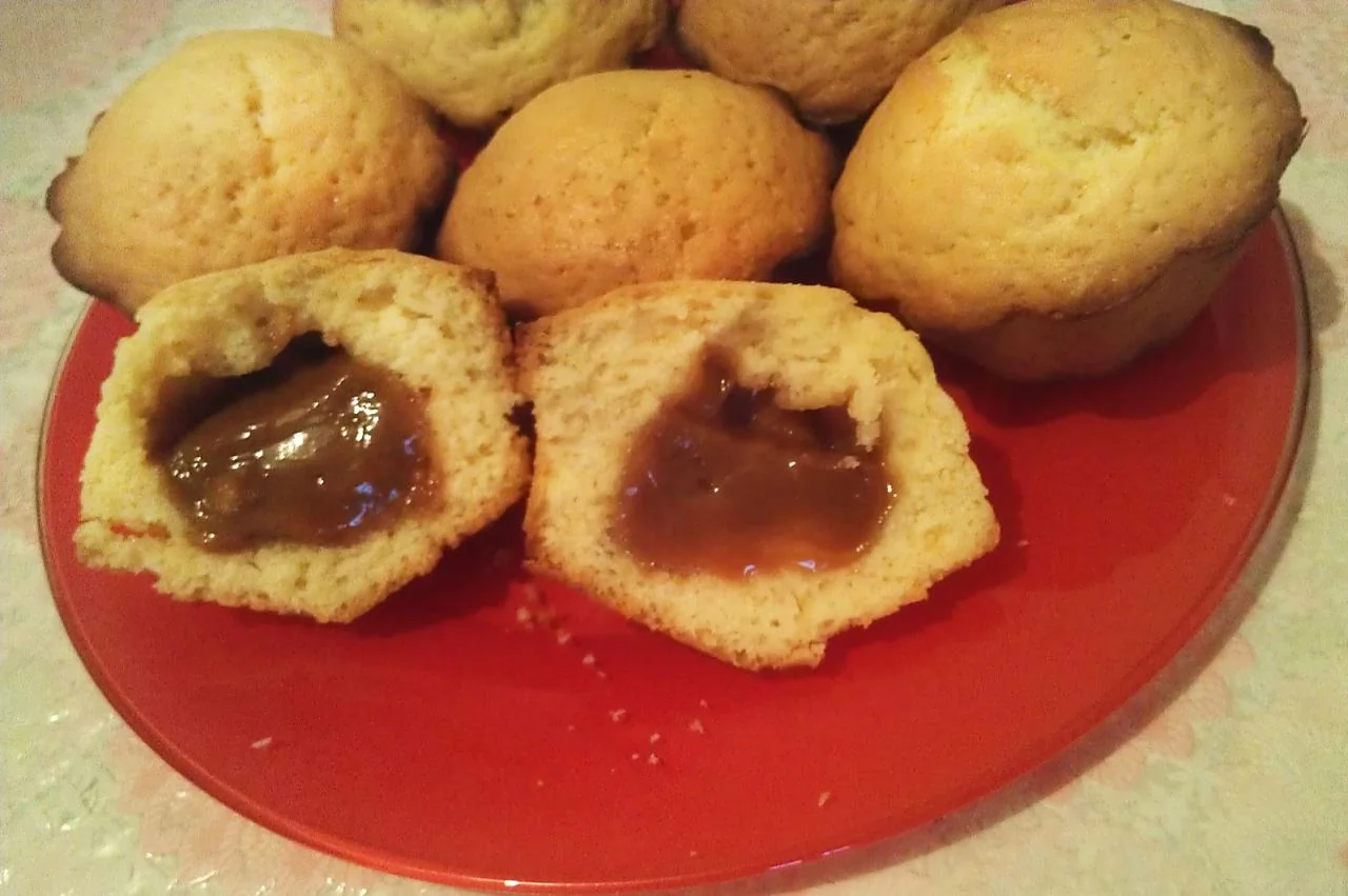 ШАГ 2 Для каждого кекса тесто делить на две части: первую выложить на дно, дальше положить чайную ложку варенного сгущенного молока и сверху выложить вторую часть теста. Таким образом заполнить форму для кексов. Выпекать при температуре 180–200 градусов до готовности. У меня ушло по 20 минут на каждую партию.