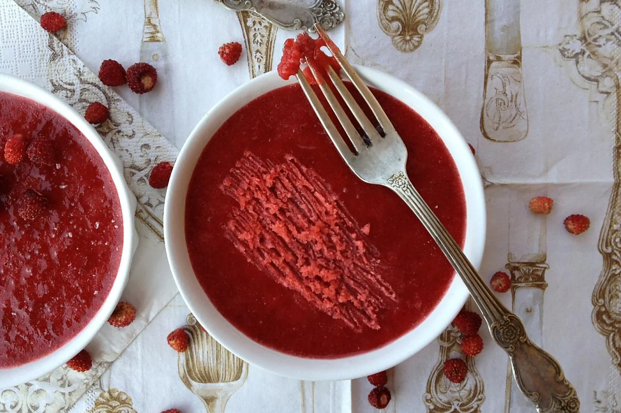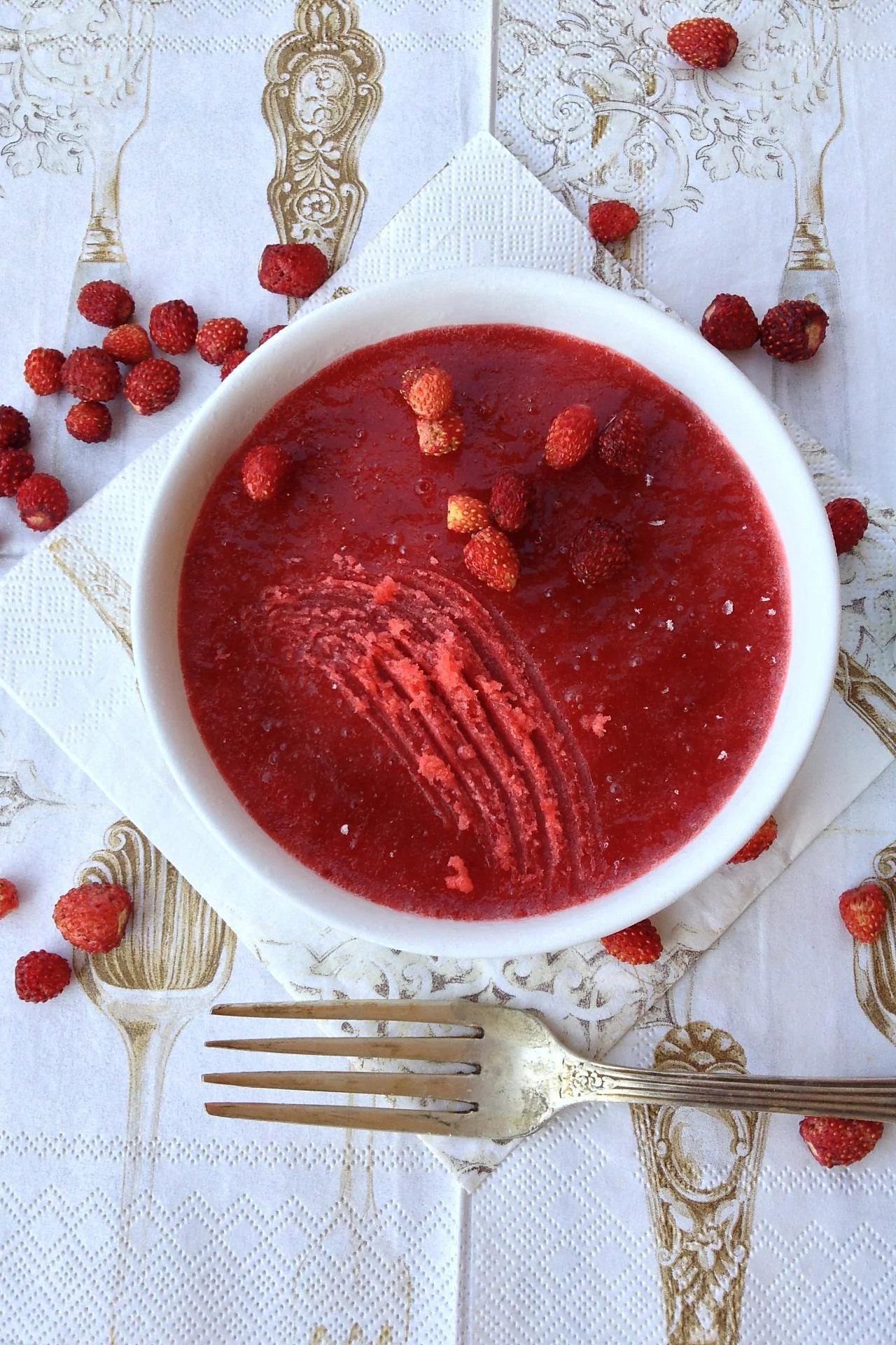ШАГ 2 Заварите чай из каркаде и кипятка, добавьте по веточке базилика и мяты, накройте крышкой и дайте настояться 20–30 минут. Процедите чай, а потом уварите его с сахаром до консистенции простого сиропа. Соедините сироп с клубничным пюре и соком лайма, перелейте получившуюся массу в глубокую пиалу или порционные пиалы, накройте пищевой пленкой и отправьте в морозилку. Взбивайте граниту вилкой каждые полчаса для более приятной и однородной конечной текстуры.