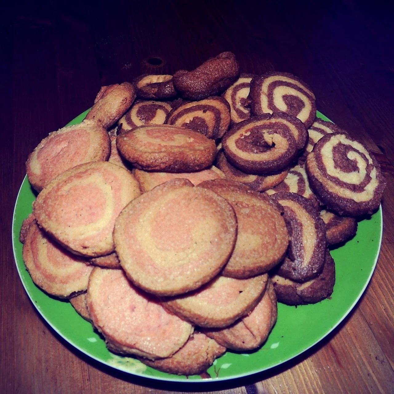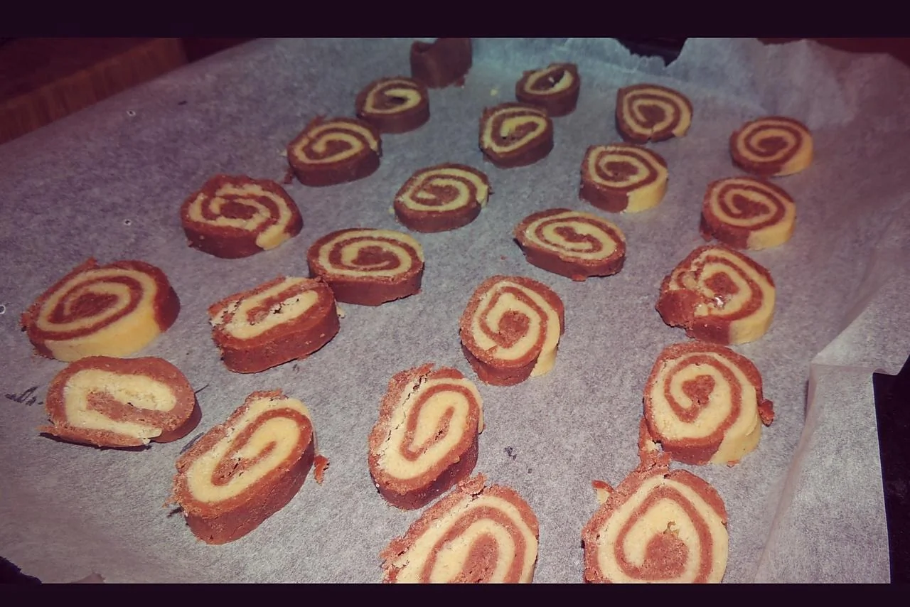 ШАГ 6 Достаем 2 куска теста из холодильника, раскатываем 1 часть в прямоугольник. Во вторую добавляем какао, так же раскатываем. Кладем по верх белой части и закатываем в рулет. Заворачиваем в пленку и отправляем в морозилку примерно на 30 минут.
