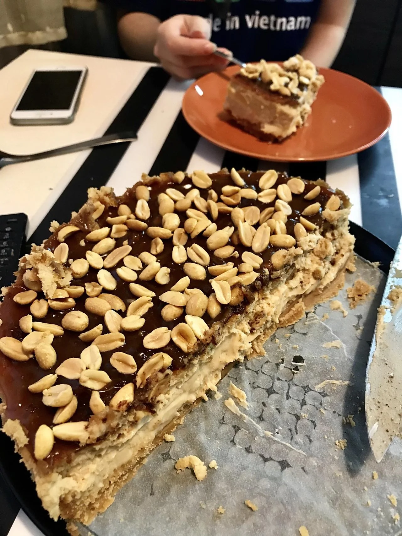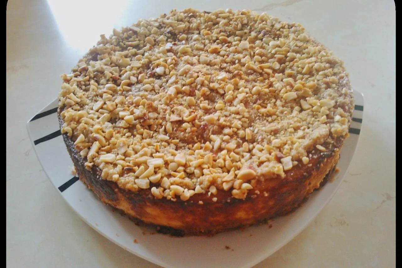 ШАГ 4 Карамель и оставшееся арахисовое масло смешать и равномерно выложить на пирог. Сверху посыпать арахисом и убрать в холодильник на ночь.