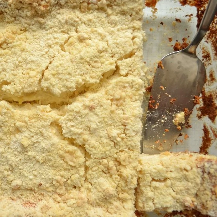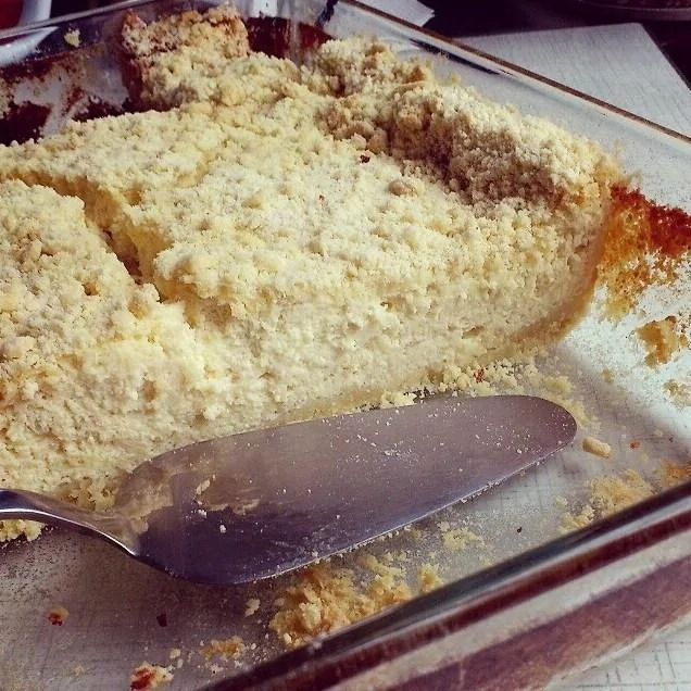ШАГ 3 Половину крошек выложить в форму. Крошки утрамбовать по дну формы. Творожную массу выложить на крошки. Сверху присыпать оставшимися крошками. Запекать в духовке при 200 градусах 40 минут до зарумянивания крошек. Серединка пирога должна еще чуть подрагивать. Оставить до полного остывания. Можно в остывающей духовке, можно на ночь. Разрезать на квадратики, подавать с чаем.