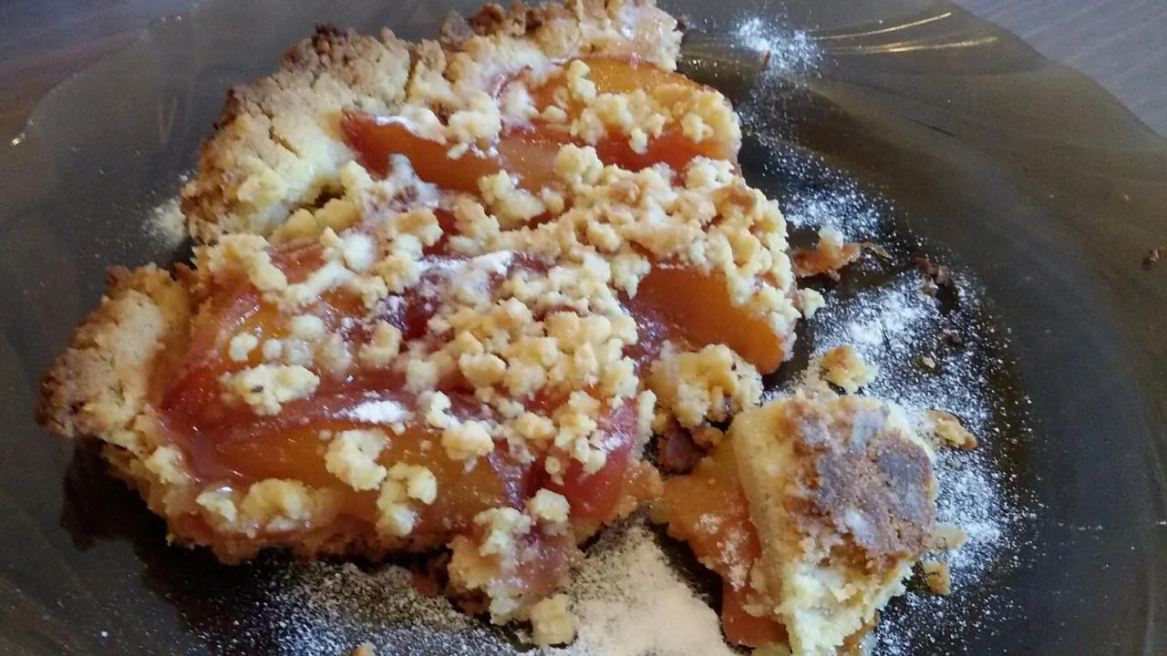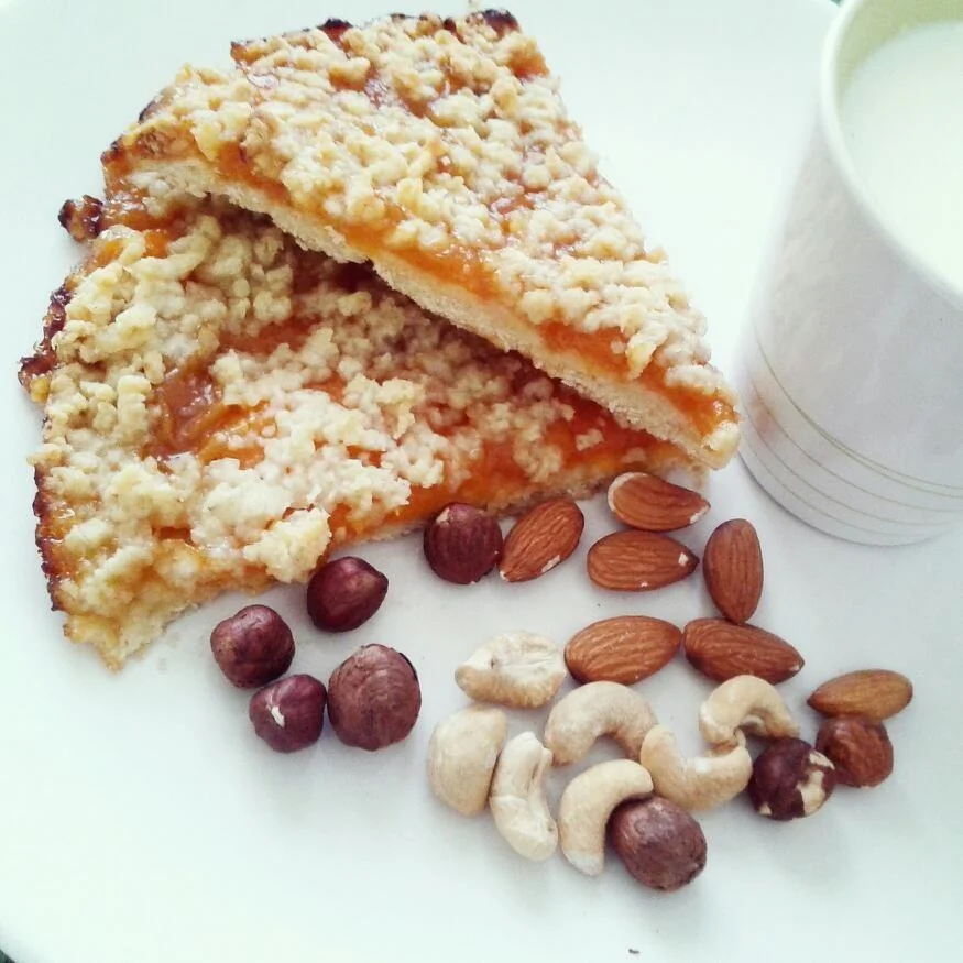 ШАГ 3 Выстелить форму пекарской бумагой (или очень хорошо смазать сливочным маслом дно), выложить 2/3 теста и равномерно распределить на дне. Сверху распределить абрикосовую начинку и последним слоем добавить оставшееся тесто в виде крошки (натереть на терке или порубить ножом).