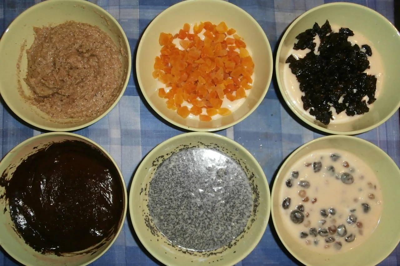 ШАГ 3 В каждую миску добавить разный ингредиент: какао-порошок, курагу, маковую начинку, изюм, мелко нарубленные грецкие орехи и чернослив.