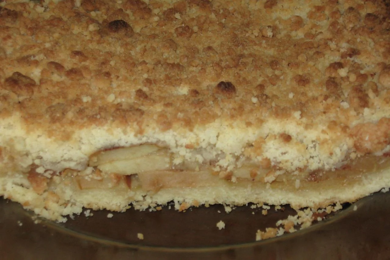 ШАГ 4 Яблоки очистить и нарезать тонкими кружочками. Уложить в подготовленную форму с тестом. Присыпать сахаром и корицей. Сверху посыпать крошкообразной засыпкой, чтобы яблок было не видно.