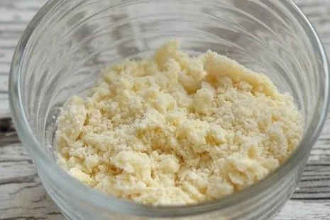 ШАГ 2 Масло 100 грамм, сахар 100 грамм, мука 150 грамм — замесить до получения крошкообразной массы.