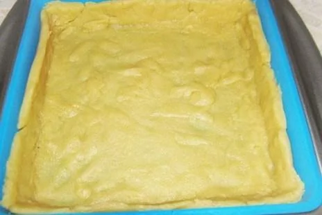 ШАГ 3 Достать тесто из холодильника и раскатать по величине формы, учитывая, что должны быть бортики 3 см высотой, разровнять равномерно руками по форме и по бортикам (рис. 4).