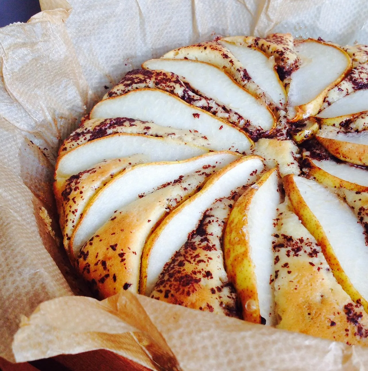 ШАГ 5 Форму для выпекания смазать маслом. Вылить сначала шоколадное тесто, затем выложить 2/3 всех груш, тонко нарезанных. Вылить другое тесто и на него аккуратно выложить оставшиеся груши.