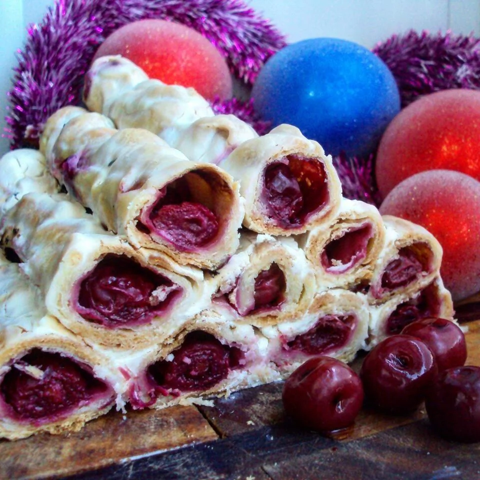 ШАГ 2 Тесто разделить на 15 равных частей. Раскатать каждую часть овальной лепешкой, проткнув ее в нескольких местах вилкой, чтобы тесто не вздувалось в духовке. Уложить на лепешки в ряд ягоды и закатать в трубочки, защипнув края. Выпекать в духовке до золотистого цвета.