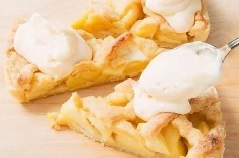 ШАГ 5 Оставшуюся часть теста раскатаем, нарежем тонкими полосами, украсим ими пирог и отправим его в духовку выпекаться 50–60 минут при температуре 200 градусов. Дадим остыть, сверху присыпем сахарной пудрой и подавать будем со взбитыми сливками или мороженым.