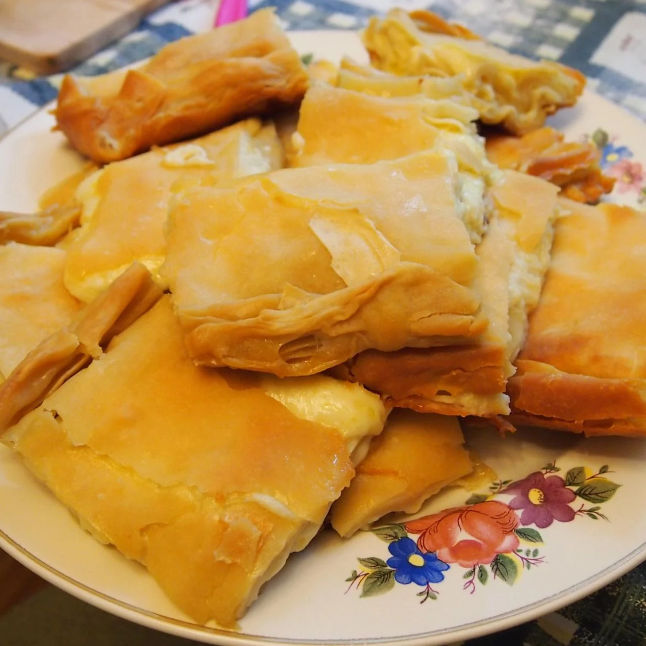 ШАГ 9 Выкладываем 3 отваренных пласта в противень, поливая каждый маслом. Сверху выложите половину сырной начинки и аккуратно распределите по всей площади. Снова 3 пласта отваренного теста, каждый смазанный маслом, и оставшуюся начинку.
