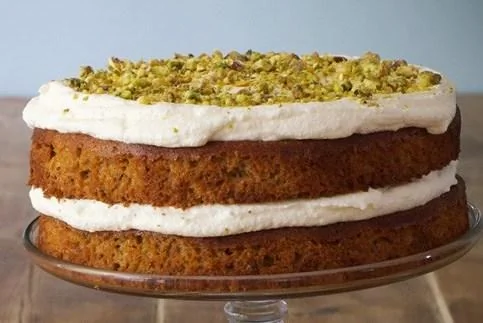ШАГ 2 Белок (9 шт) взбить с лимонной кислотой до мягкости. Всыпьте сахар (30 г) и взбивайте до уплотнения массы. Пудру просеять с измельченными до состояния муки фисташками (очищенными!). Добавьте к белкам, перемешивая снизу. Добавьте рубленные фисташки. Перемешать до однородности. Духовку разогрейте до 200 градусов. Форму круглой формы выстелить бумагой и выложить тесто. Выпекать 15 минут. Готовый бисквит перевернуть и снять бумагу.