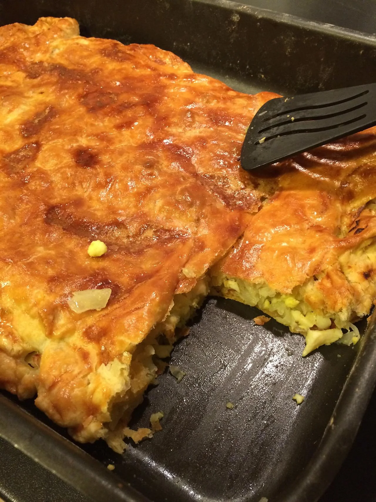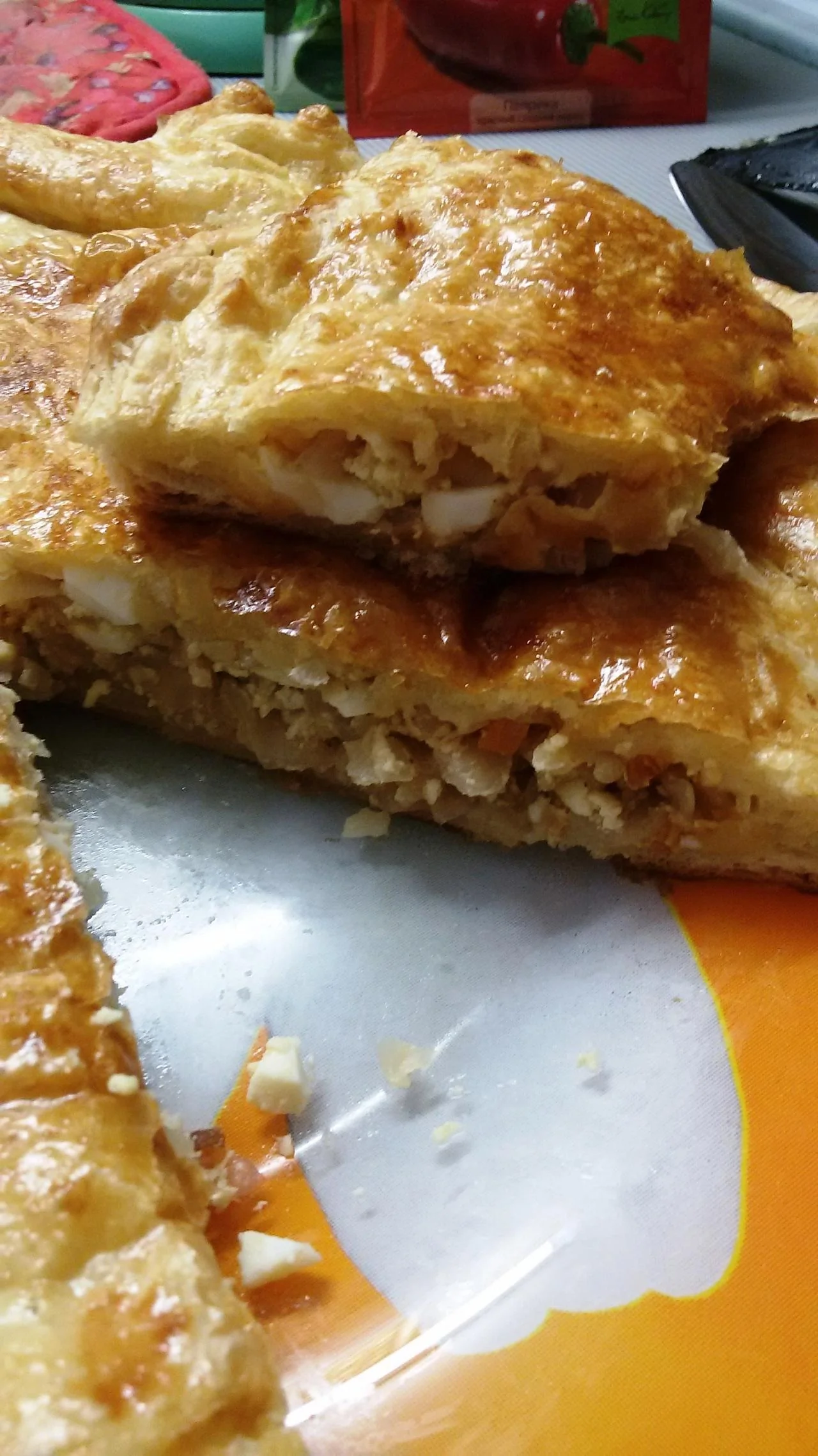 ШАГ 6 Оба пласта теста раскатать по размеру противня. На одну часть выложить начинку, накрыть сверху вторым слоем. Края защипнуть, а из обрезков теста выложить на поверхности пирога произвольный узор и смазать ее взбитым яйцом. Поставить в духовку, разогретую до 180 градусов, примерно на сорок минут. Немного остудить и подавать.