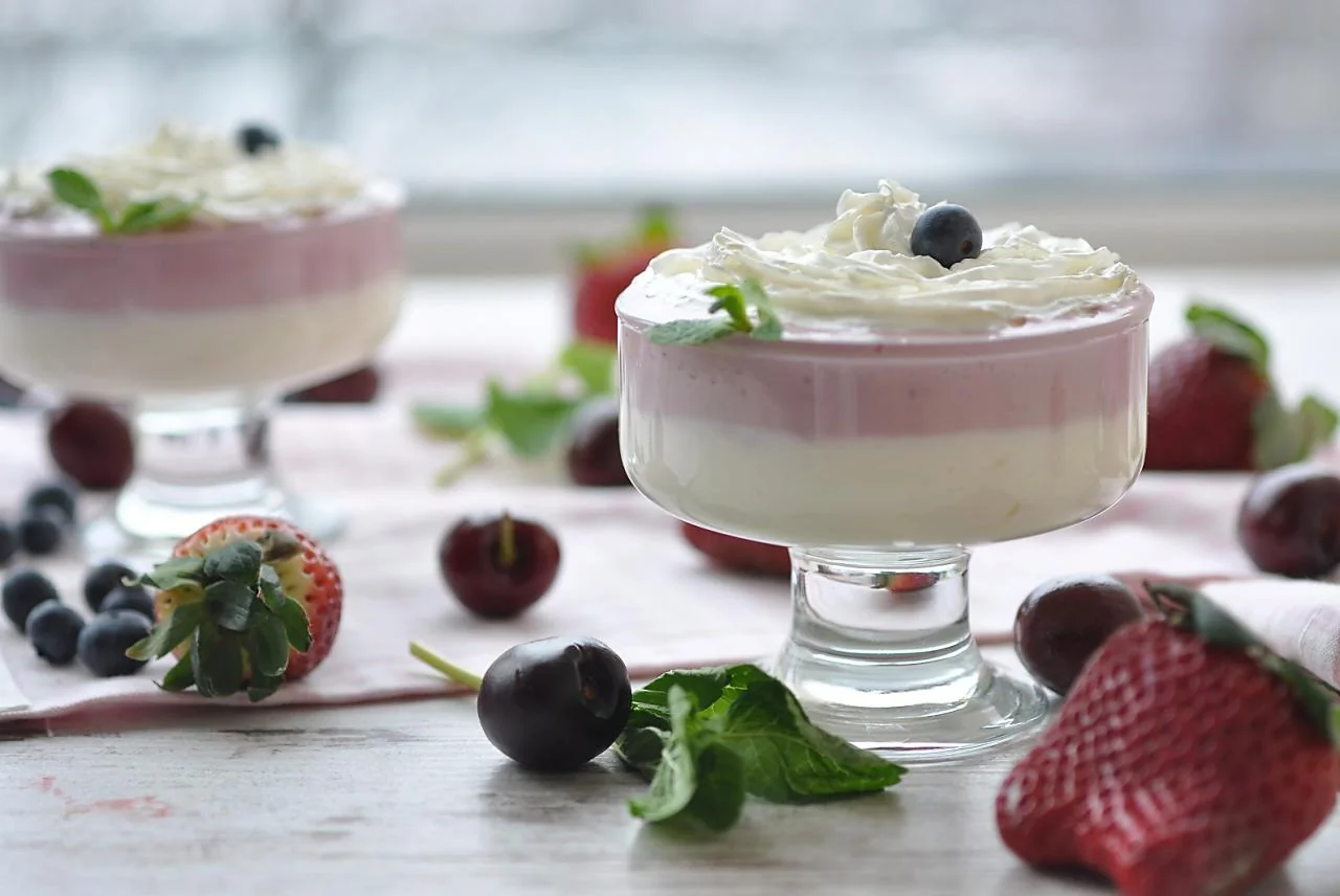 ШАГ 5 В стаканы выложить белый йогурт, сверху выложить йогурт с черникой, украсить взбитыми сливками и ягодами черники.