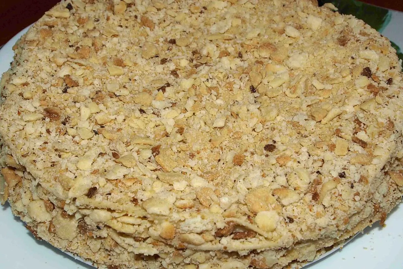 ШАГ 8 Коржи намазать кремом, посыпать крошкой и отправить на 5–6 часов настояться в холоде.