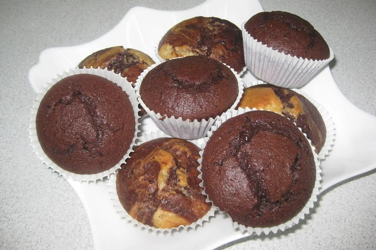 ШАГ 1 Для приготовления теста отдельно смешать смеси для приготовления классических и шоколадных маффинов с молоком, растительным маслом, яйцом и вымесить до однородного состояния в соответствии с инструкцией на упаковках. На противне разложить 24 бумажные корзиночки.