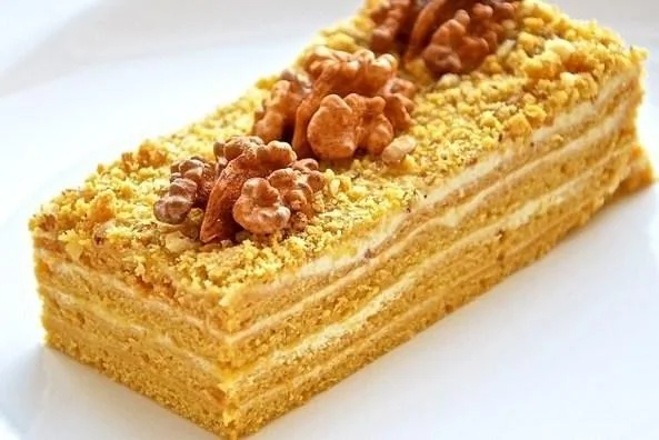 ШАГ 8 Готовым коржам придать одинаковую форму и смазать кремом: банка сгущенки + пачка сливочного масла (комнатной температуры). Перемешать.