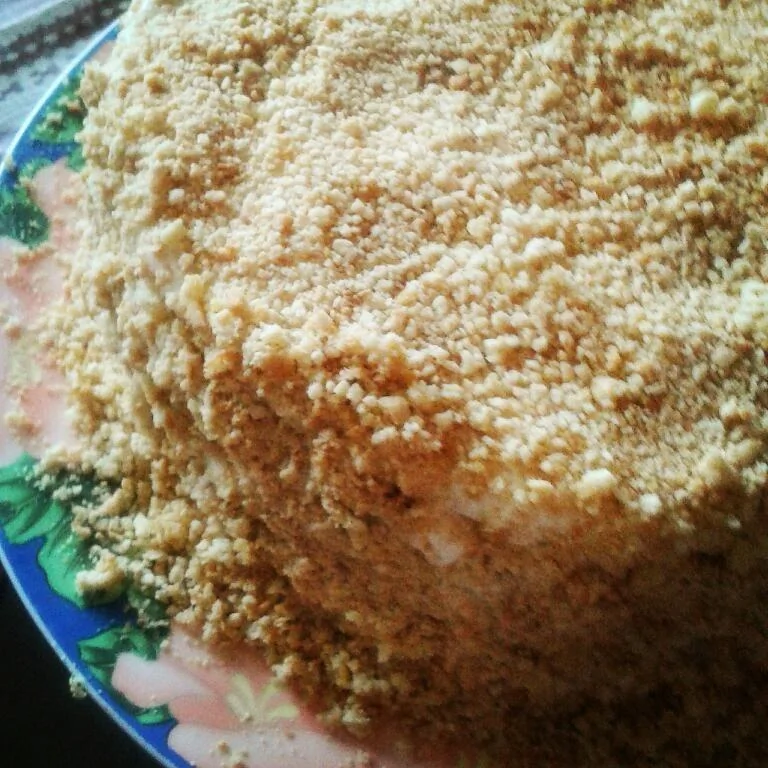 ШАГ 9 Остатки теста от коржей мелко растереть и обсыпать верх тортика и его бока (предварительно смазав кремом).