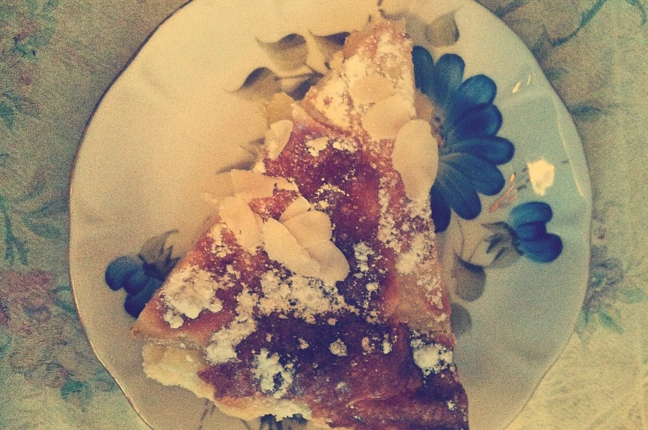 ШАГ 7 Готовую песочную форму посыпать миндальной мукой, выложить груши и залить кремом.