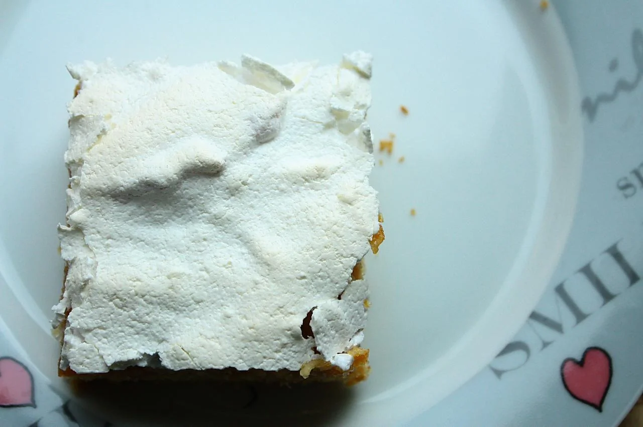 ШАГ 3 Пока пирог в духовке, сделать безе: взбить 3 белка со стаканом сахара до мягких пиков, примерно минут 5. С безе печь еще минут 5.