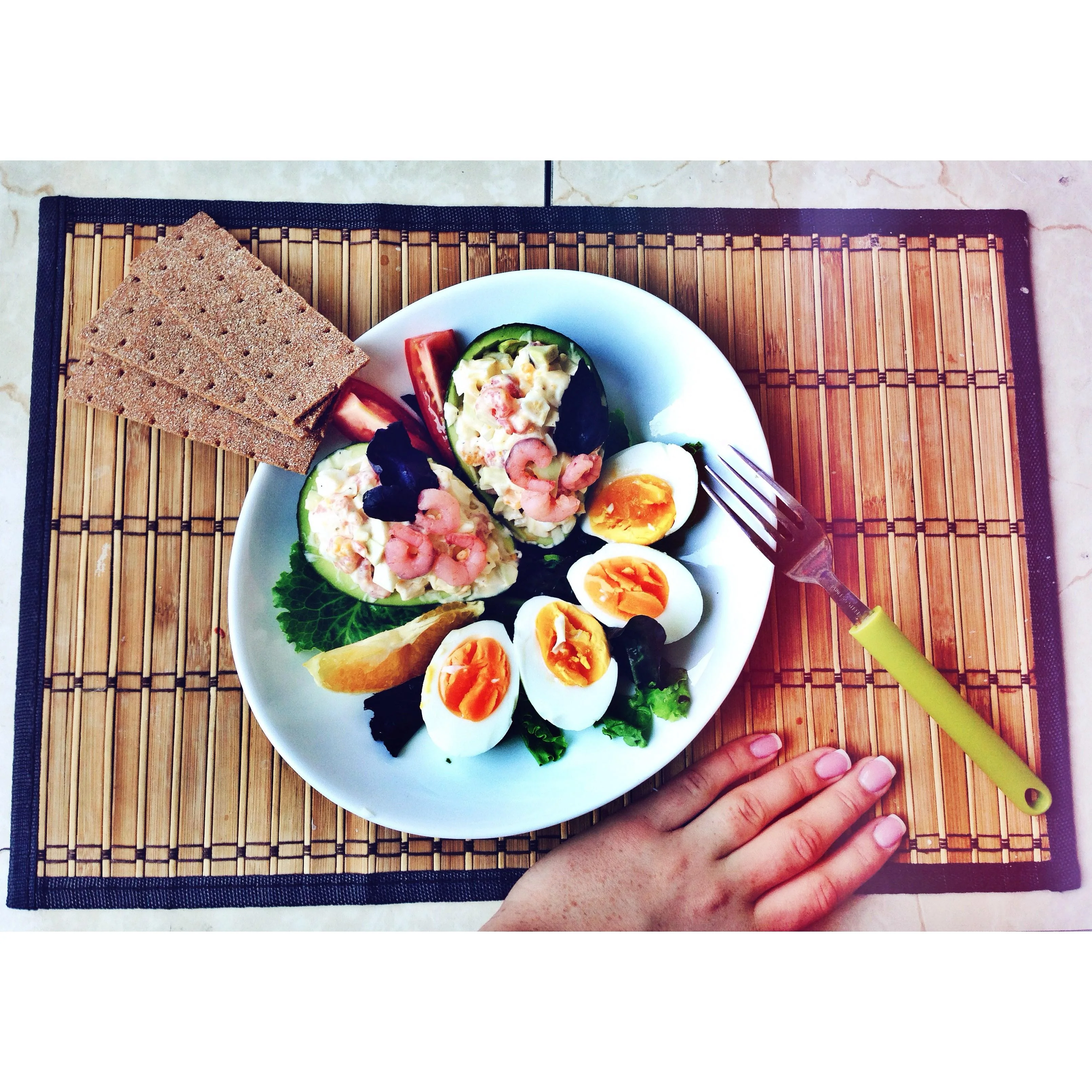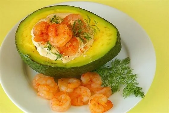 ШАГ 3 Получившейся массой заполнить половинки кожуры — сверху украсить оставшимися креветками и маслинами. Блюдо готово.