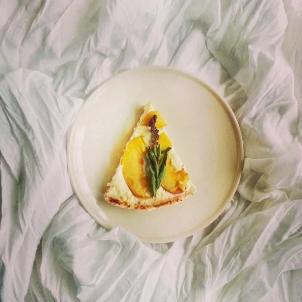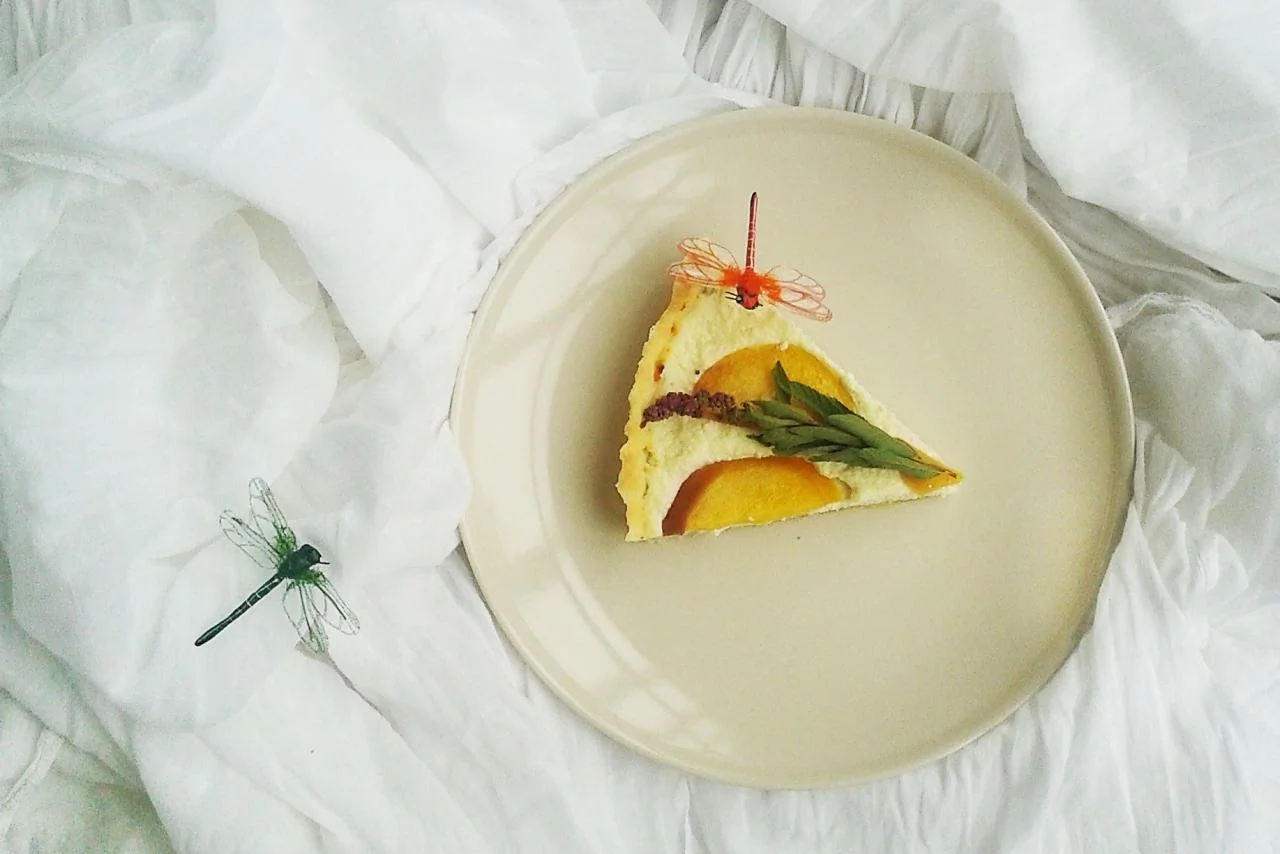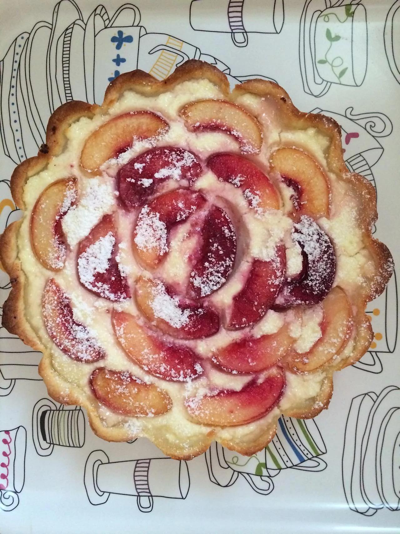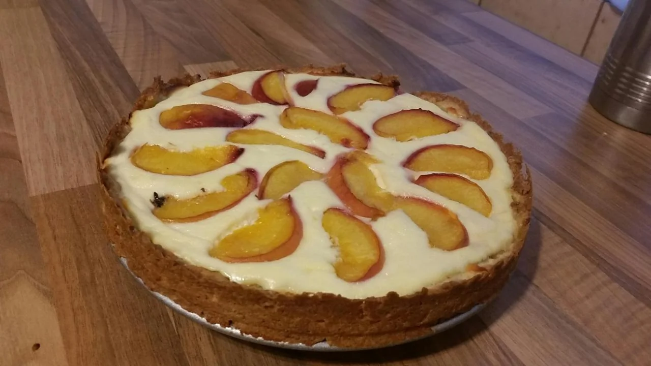 ШАГ 3 Распределяем тесто по форме, выравнивая костяшками пальцев. Выкладываем творожную массу на тесто, равномерно распределяя. Нарезаем персики на дольки и красиво раскладываем на начинку, немного вдавливая.