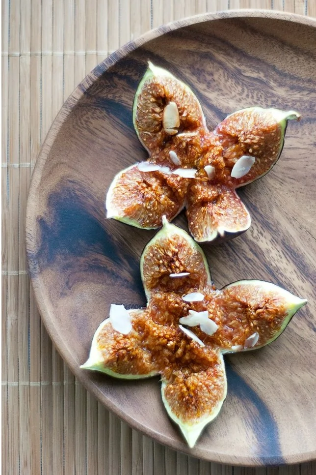 ШАГ 2 Глубоко надрезать инжир крест накрест и раскрыть его. Полить каждый ложкой меда, положить по кусочку масла и посыпать корицей по вкусу и крошеным миндалем, или лепестками миндаля, как у меня.
