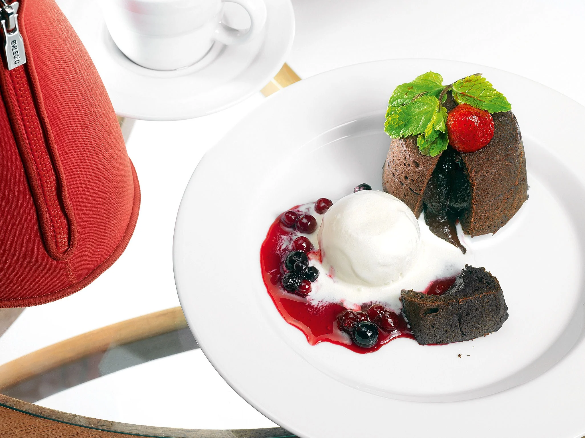 ШАГ 6 Кексы в духовке должны покрыться тонкой корочкой. Середина будет немного провисать, так как останется жидкой. Готовые кексы вынуть из духовки, тонким ножом пройтись вдоль бортиков и перевернуть их на тарелку. Рядом положить шарик мороженого, полить все компотом и сразу же подавать — пока горячая начинка не застыла.