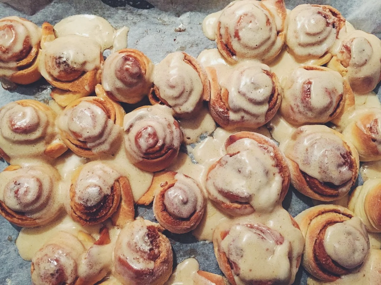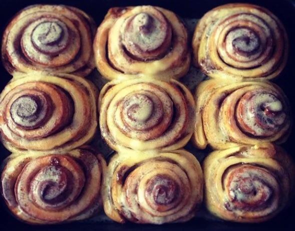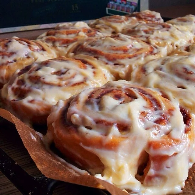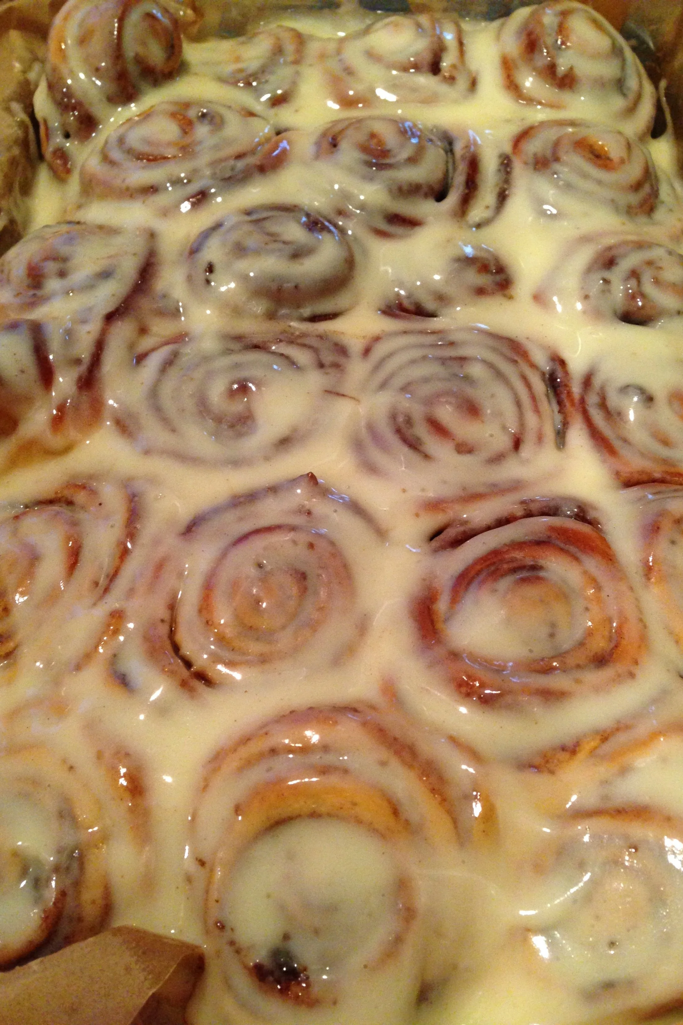 ШАГ 18 После того, как булочки подрумянились и готовы, вынимаем их из духовки и сразу покрываем сливочной смесью (можно размазывать кисточкой, а можно и залить). В конце можно украсить по желанию тертым шоколадом или орешками. Но оригинальный вкус ни с чем не сравнить.