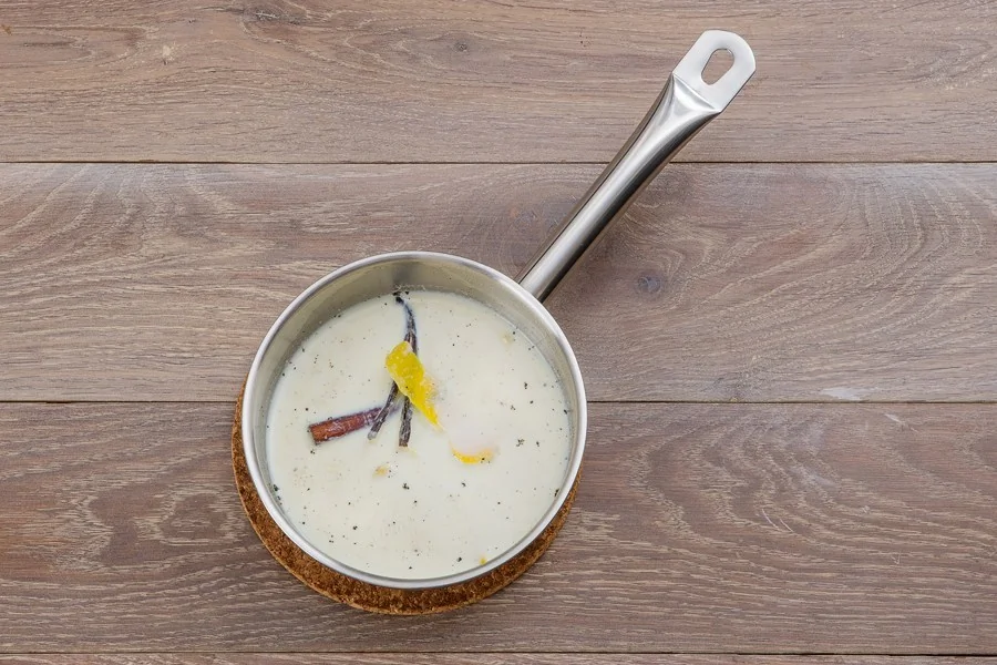 ШАГ 4 Влейте тонкой струйкой яично-сливочную смесь в молоко постоянно помешивая венчиком, достаньте половину стручка ванили, цедру и палочку корицы, перелейте в металлическую посуду и поставьте на водяную баню.