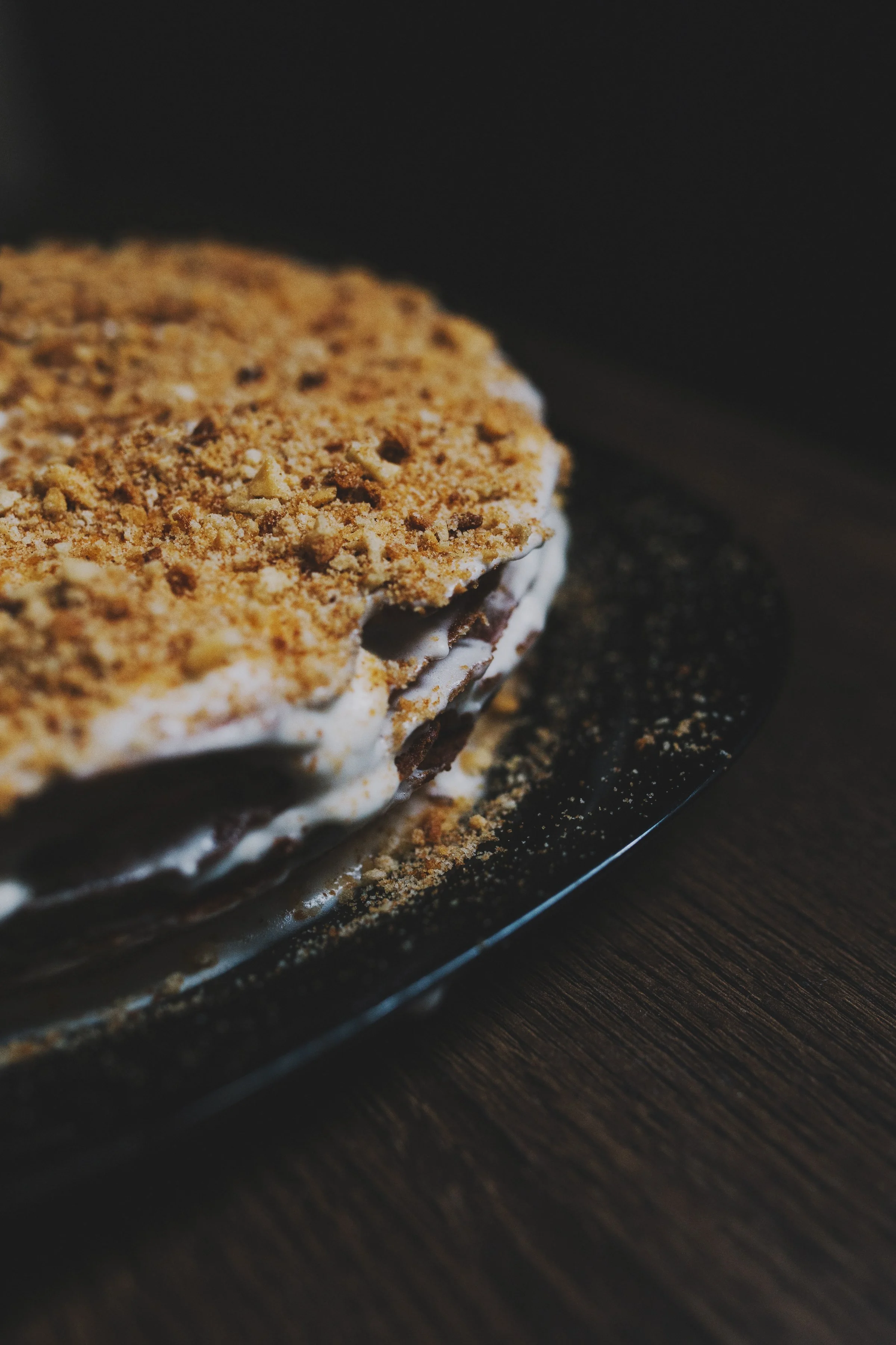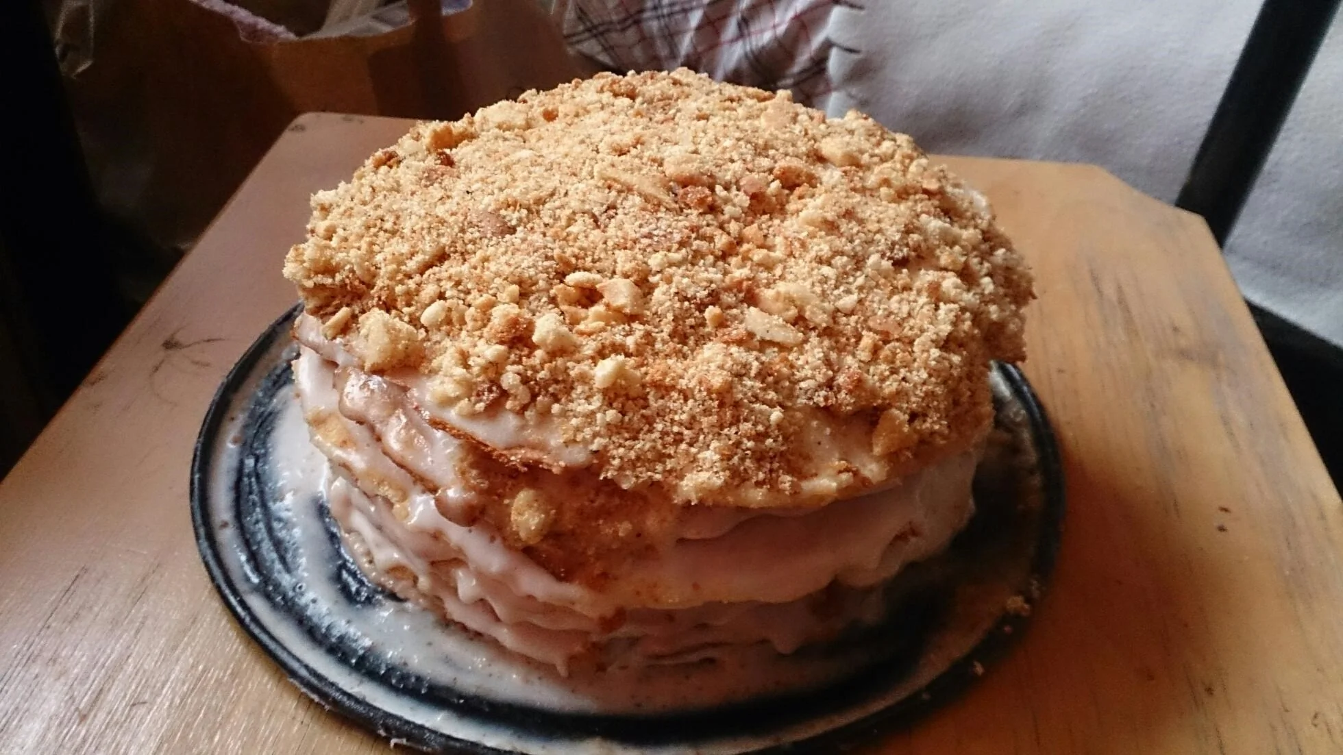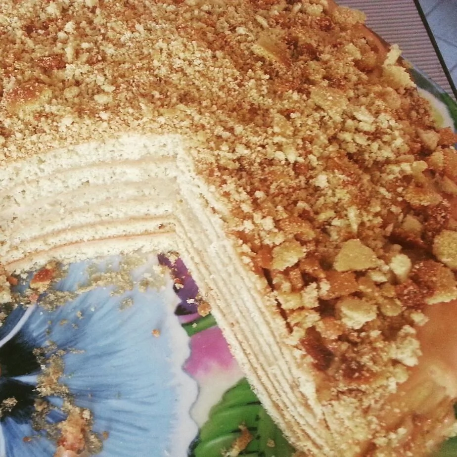 ШАГ 13 В конце верхний корж и бока торта обмазать кремом. Обсыпать крошкой весь торт. Торт убрать в холодильник для пропитки на пару часов.