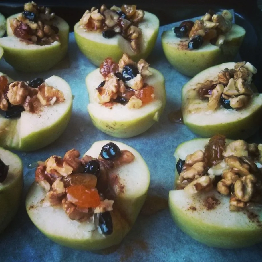 ШАГ 6 Выложить яблоки на противень, посыпать корицей и в каждое яблоко положить по ложке полученной смеси (т.е. равномерно разложить всю смесь на имеющиеся яблоки).