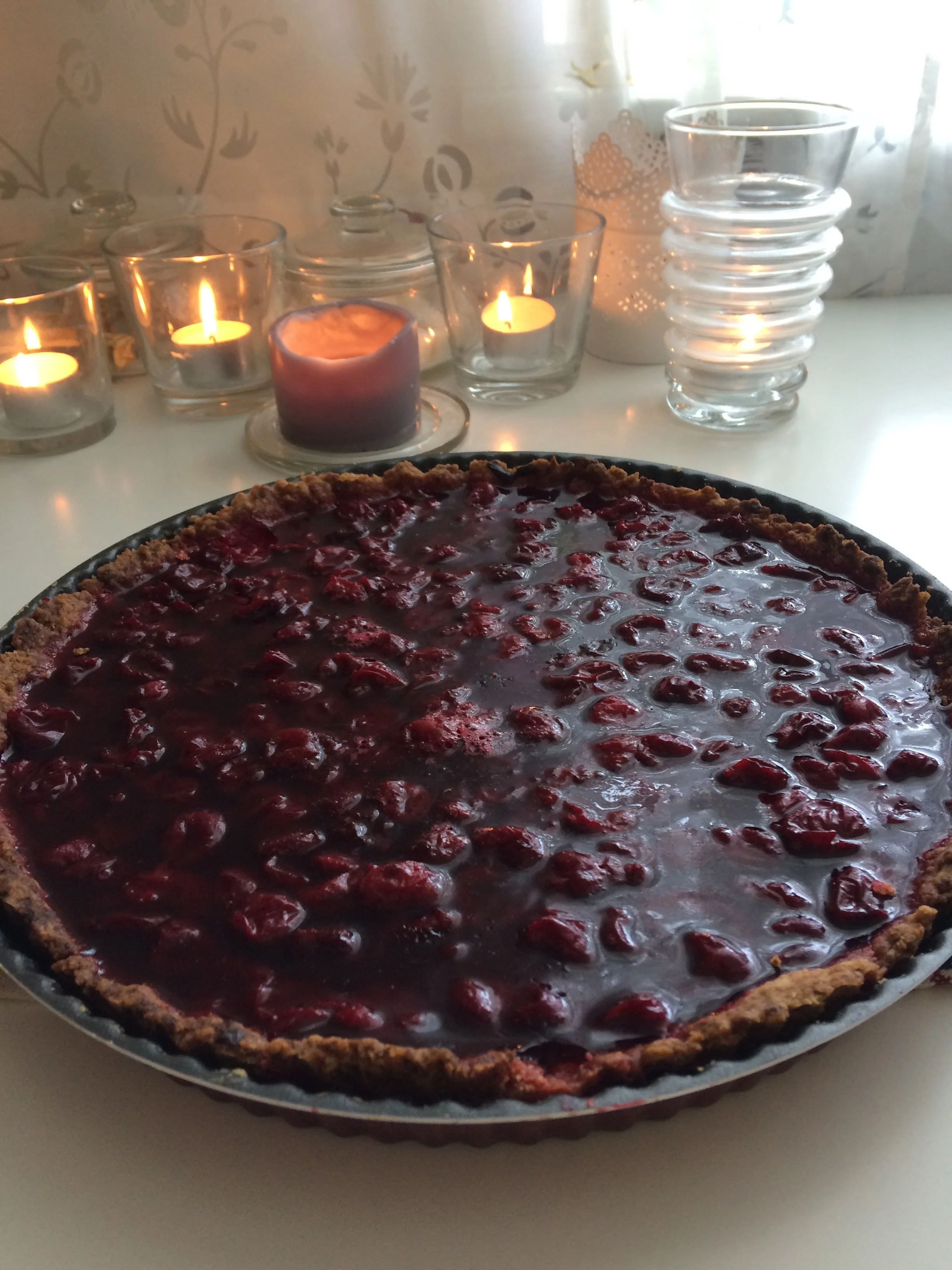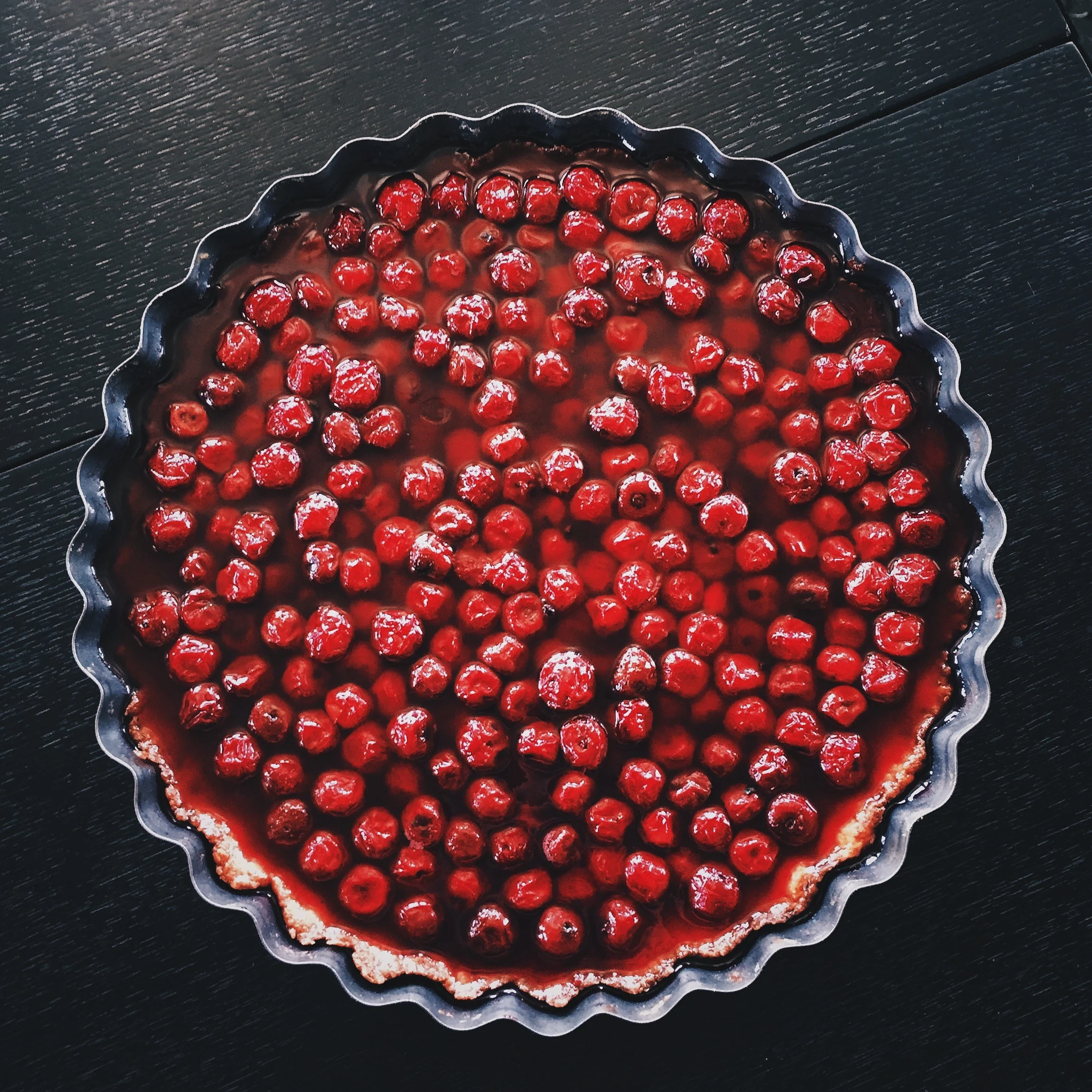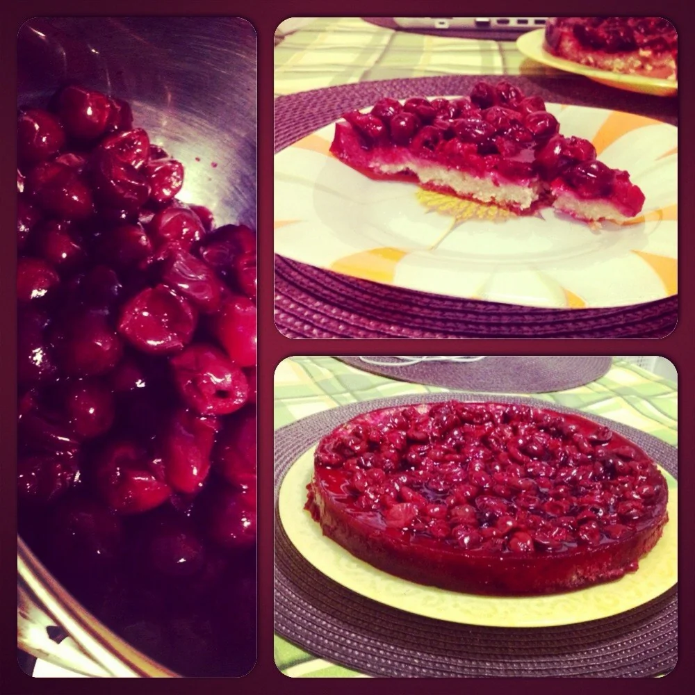 ШАГ 7 На готовую основу выложить вишню (без жидкости — ее сохранить) и поставить в холодильник. Когда основа остынет, немного вылить на нее вишневый сок и сразу поставить на холод. Примерно через час пирог застынет и его можно будет подавать.