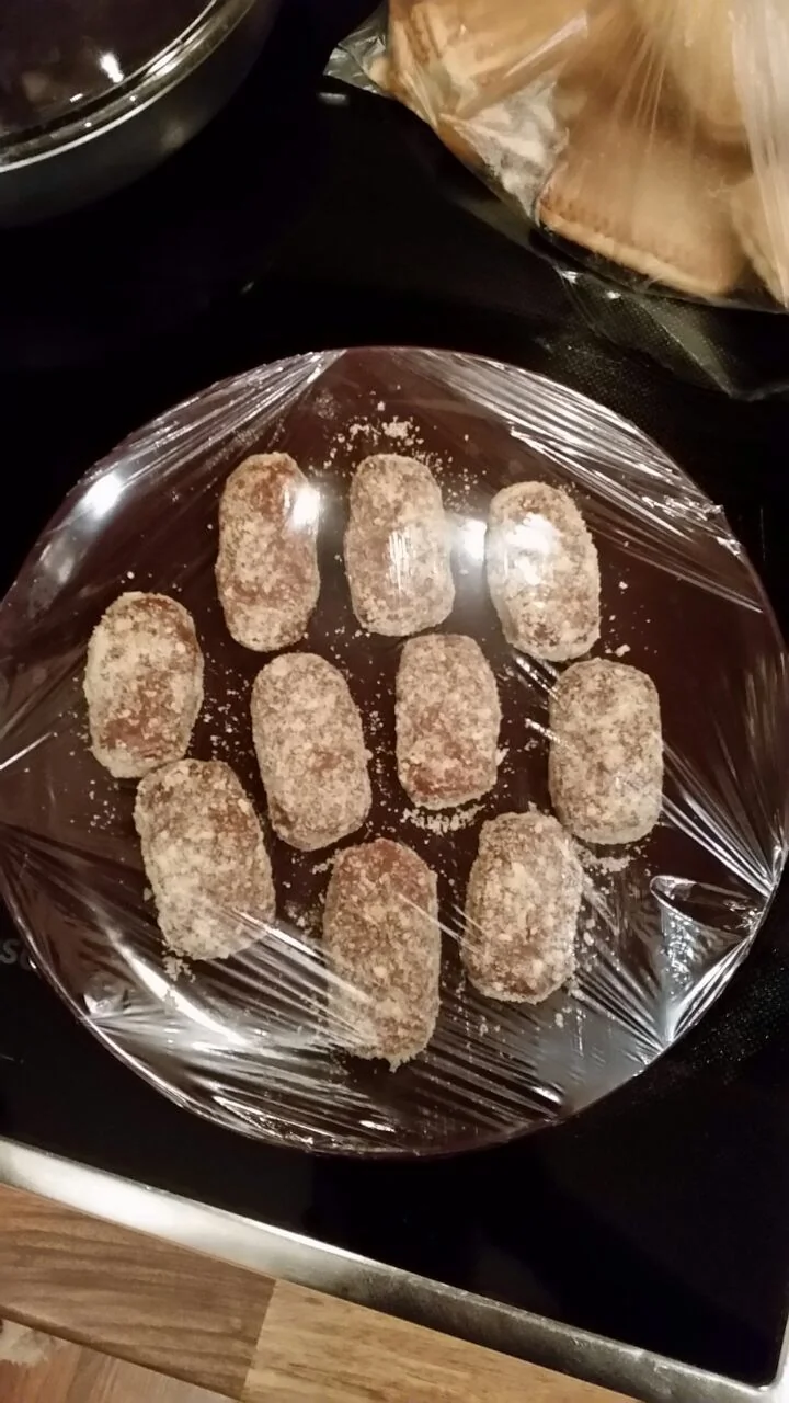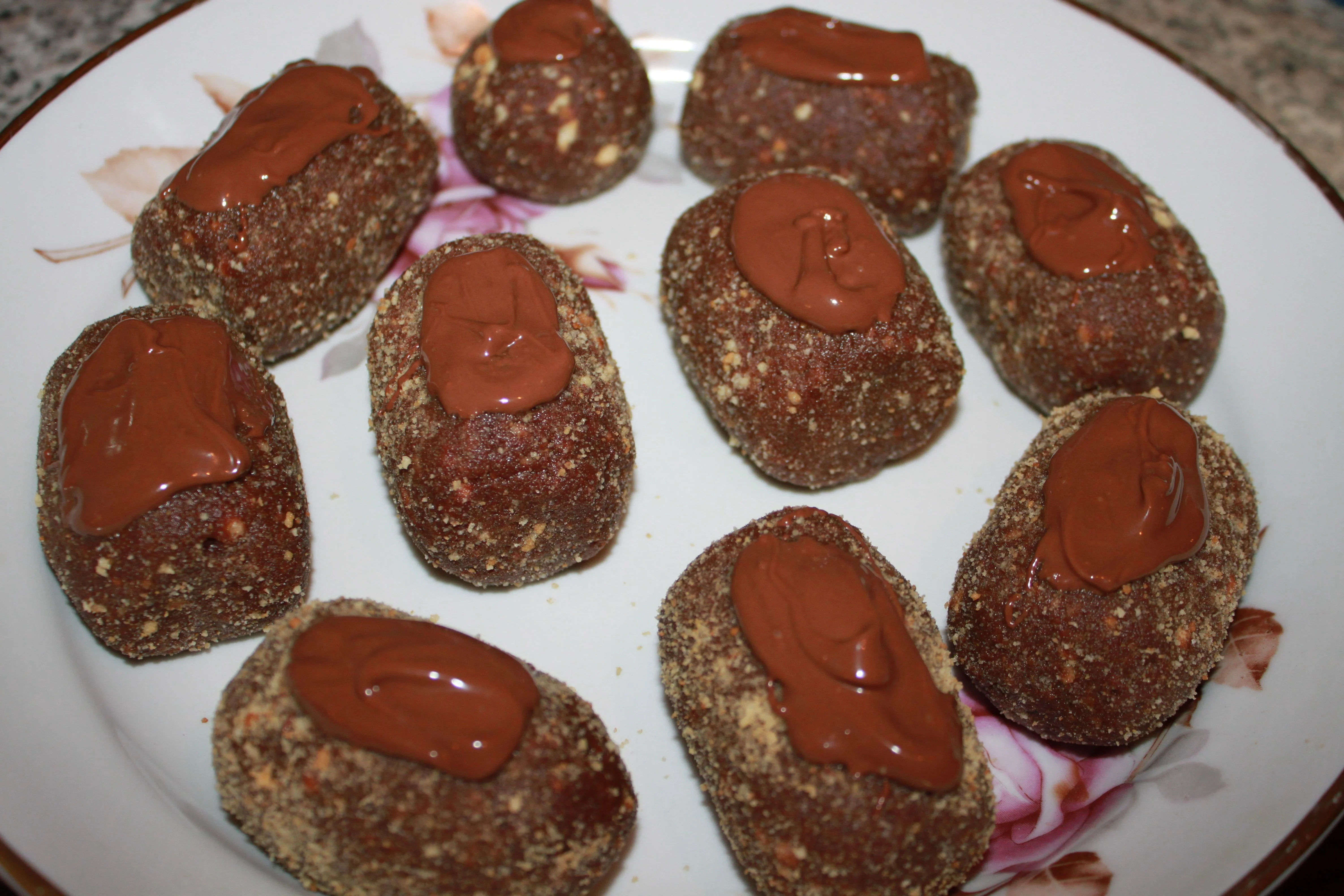 ШАГ 4 Из полученной массы вылепить пирожные желаемой формы, обкатать их в заранее отложенных крошках печенья. Выложить пирожные на блюдо.