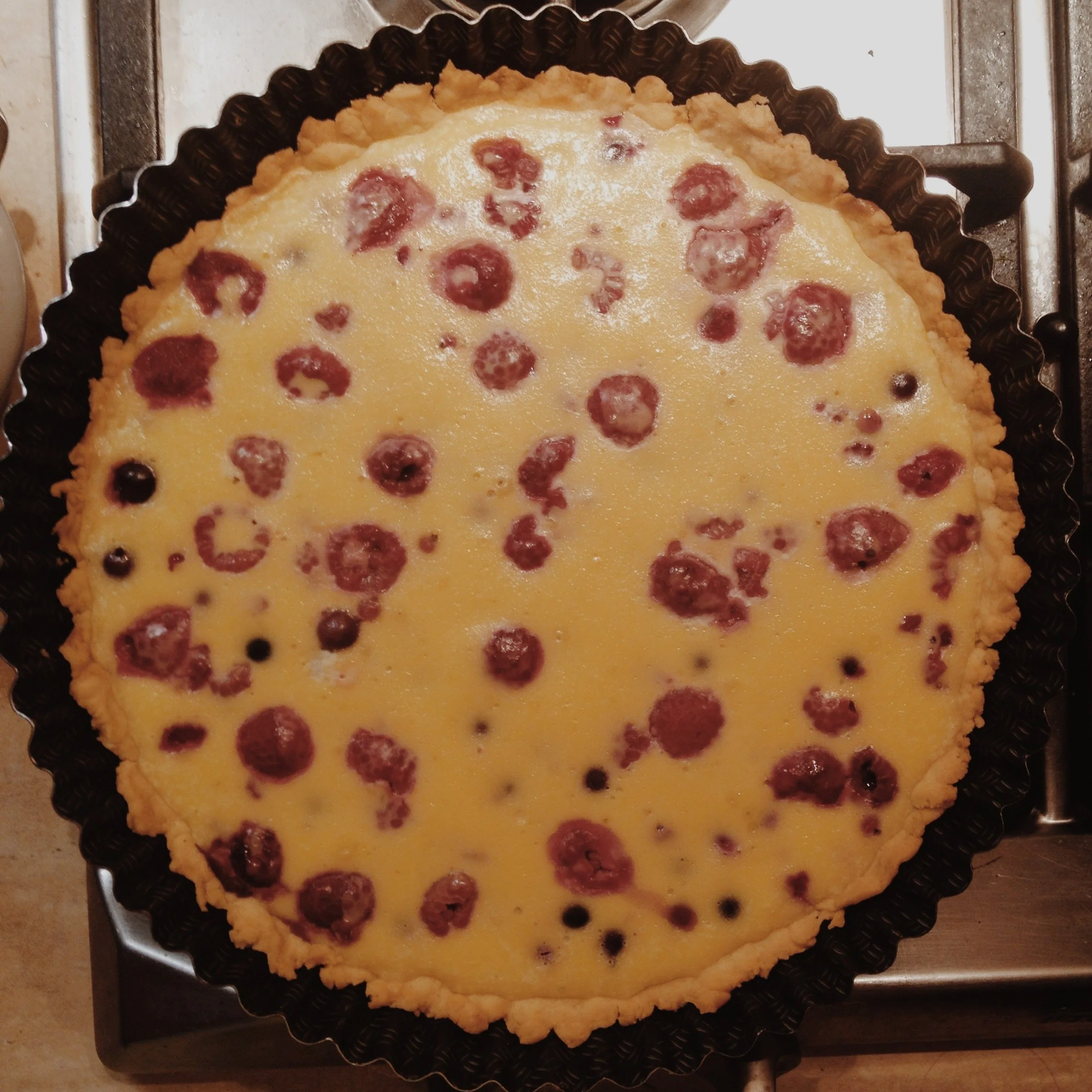 ШАГ 4 Затем разогреть духовку до 200 градусов. Смазать круглую форму маслом, раскатать тесто и аккуратно выложить в форму. Поставить тесто в духовку на 10 минут. Затем вынуть, остудить и выложить сверху малину, залить тестом кляфутти. Поставить в духовку еще на 10–15 минут.