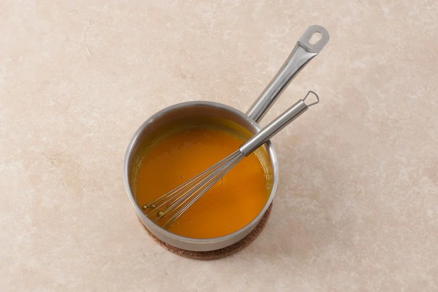 ШАГ 2 Пюре из манго переложите в сотейник, добавьте сахар, доведите до кипения, снимите с огня и введите желатин, непрерывно помешивая венчиком.