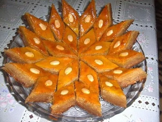 ШАГ 4 После разрезать пахлаву ромбом размером 10х4 сантиметра, смазать яичным желтком и в середину каждого ромба положить лесной орех или миндаль. Выпекать в течение 40–45 минут при 180–200 градусах. В это время приготовить сироп из стакана сахарной пудры и стакана горячей воды. Горячим сиропом полить готовую пахлаву и снова поставить в духовку на 7 минут.