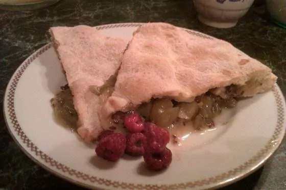 ШАГ 2 Форму смазать маслом. Из теста сформовать две лепешки, между которыми поместить ягоды крыжовника, края защипать. Пирог поставить в духовку на 40–50 минут.