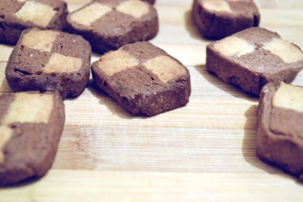 ШАГ 5 Раскатать шоколадное тесто в прямоугольник толщиной в 1 см. Достать из холодильника белое тесто и раскатать его в прямоугольник такого же размера. Смазать шоколадный прямоугольник холодной водой и положить на него белый. Отрезать от длинной стороны получившегося прямоугольника полосу шириной 1 см. От прямоугольника отрезать еще одну такую же полосу, и соединить с первой, предварительно смазанной холодной водой, белой стороной к черной, а черной к белой.