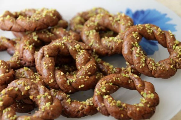 ШАГ 7 Выкладываем веночки на противень, смазываем желтком, перемешанным со столовой ложкой воды, посыпаем фисташками.