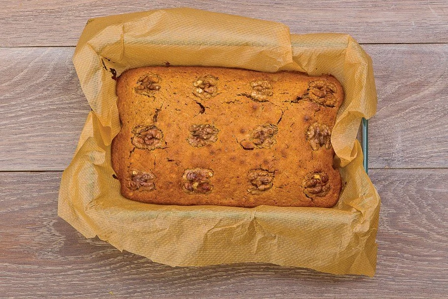 ШАГ 6 Небольшой глубокий противень выстелите бумагой для выпечки, смажьте оставшимся сливочным маслом, выложите тесто, разровняйте и разложите сверху половинки грецких орехов, выпекайте в заранее разогретой до 190 градусов духовке 20 минут.