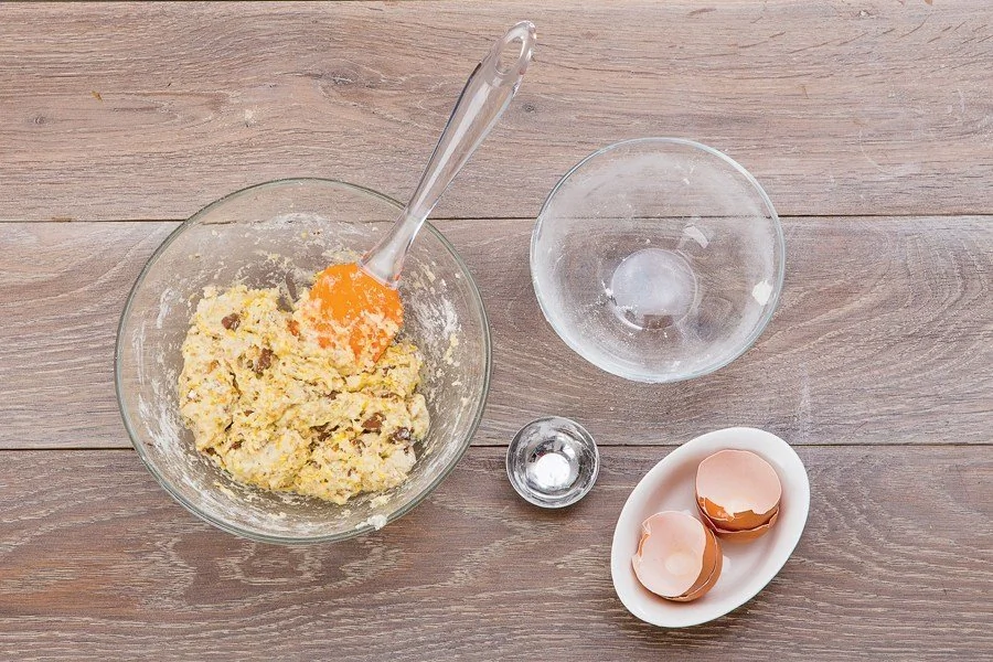ШАГ 4 Поломайте шоколад руками на мелкие кусочки; муку перемешайте с разрыхлителем, добавьте рубленные орехи, шоколад, апельсиновую цедру, яйца, посолите и все перемешайте.