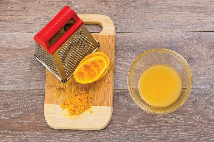 ШАГ 2 Цедру апельсина натрите на мелкой терке, выжмите сок.