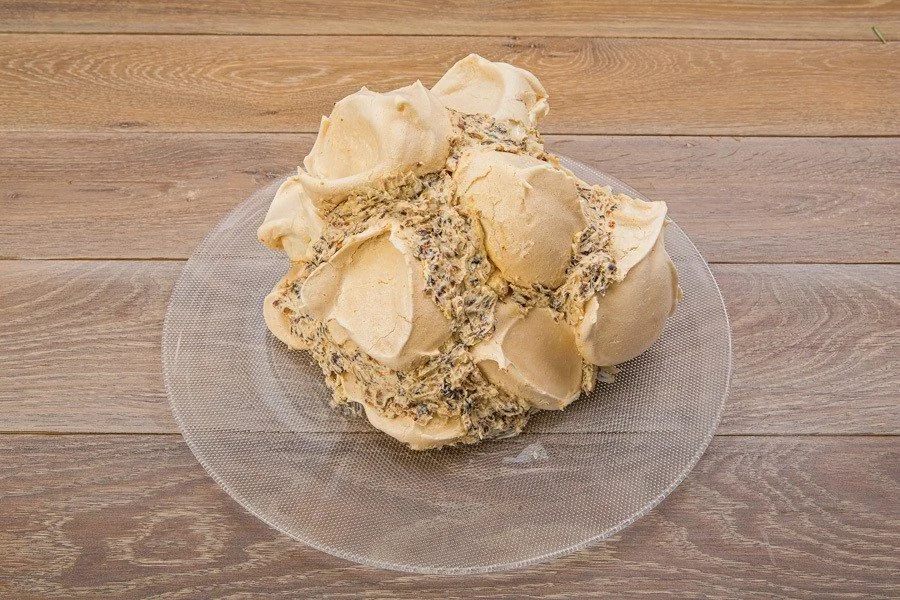ШАГ 6 На тарелку выложите ложку крема, размажьте и начинайте выкладывать на него безе по диаметру всей тарелки, сверху уложите следующий ряд безе, смазывая нижнюю часть каждого безе; таким образом уложите весь торт в виде горки, промазывая кремом каждый слой.
