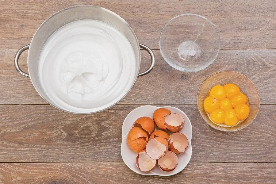ШАГ 1 Охладите яйца; отделите белки от желтков; взбейте белки до плотной пены, постепенно увеличивая скорость, введите сахар небольшим частями и взбивайте до полного растворения сахара, до крепкой глянцевой пены, не менее 7 минут.
