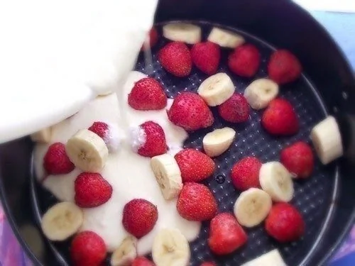 ШАГ 3 Фрукты промыть и выложить на дно формы (любые ягоды, бананы, персики все что вам нравится).