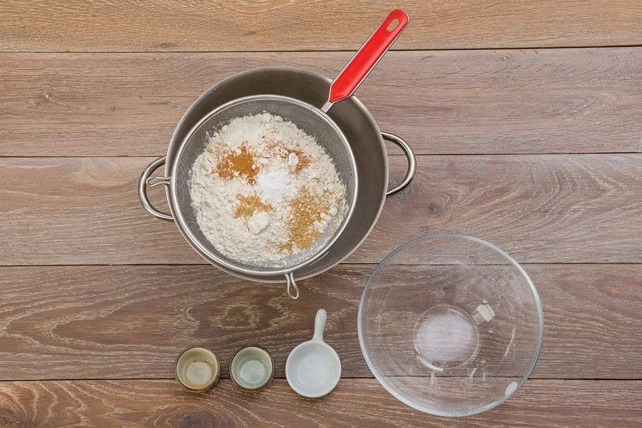 ШАГ 1 Просейте в миску муку из большого пакета, соду, имбирь и корицу.